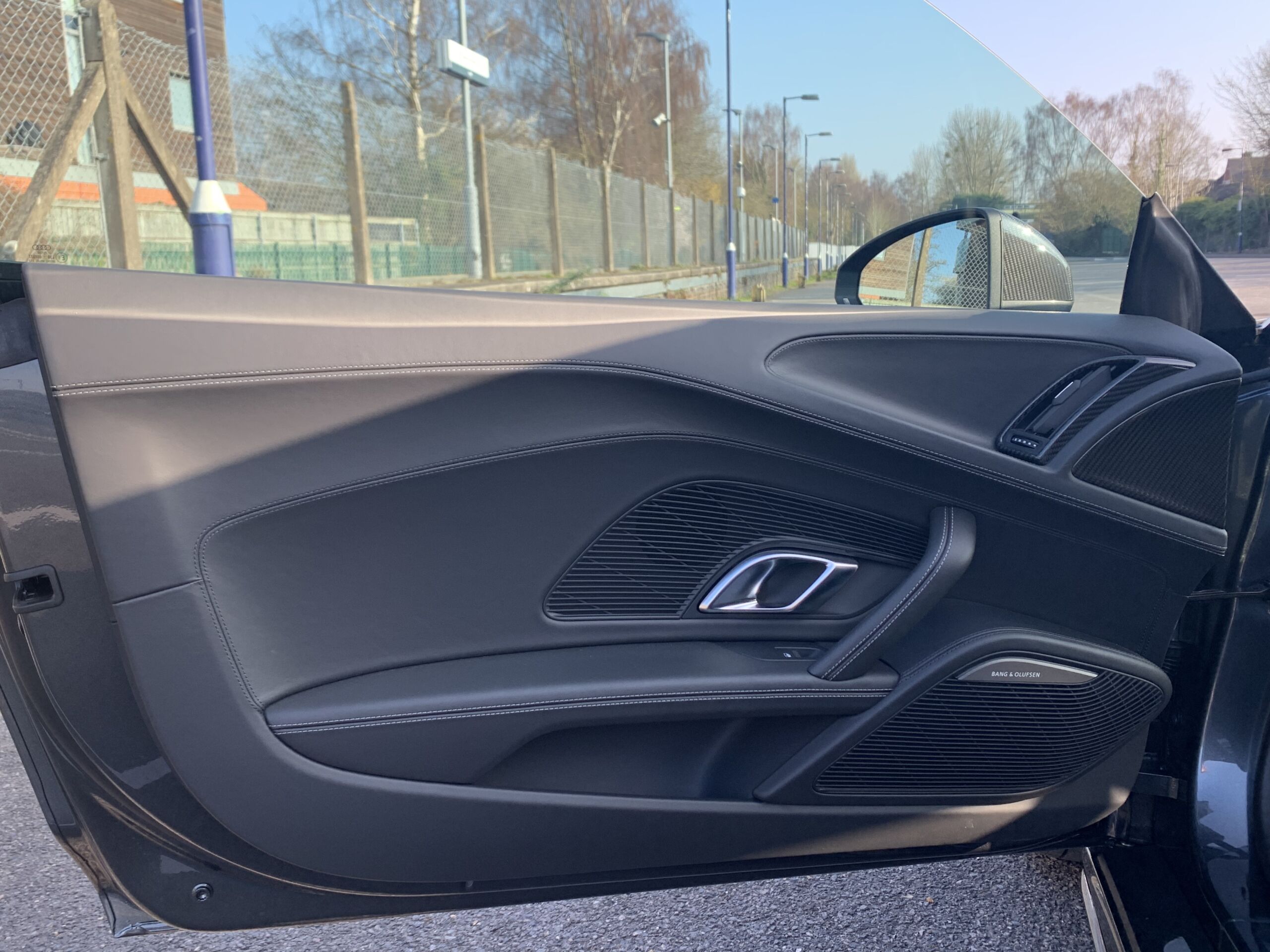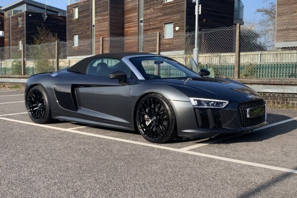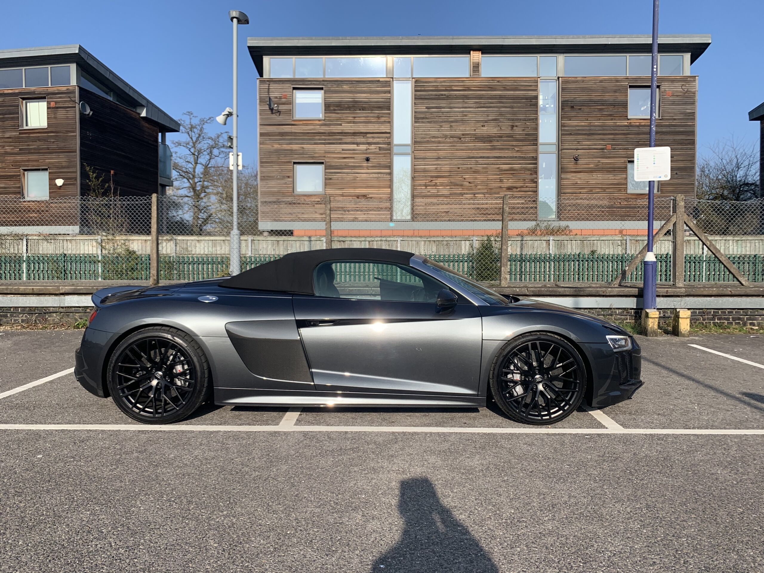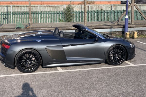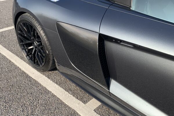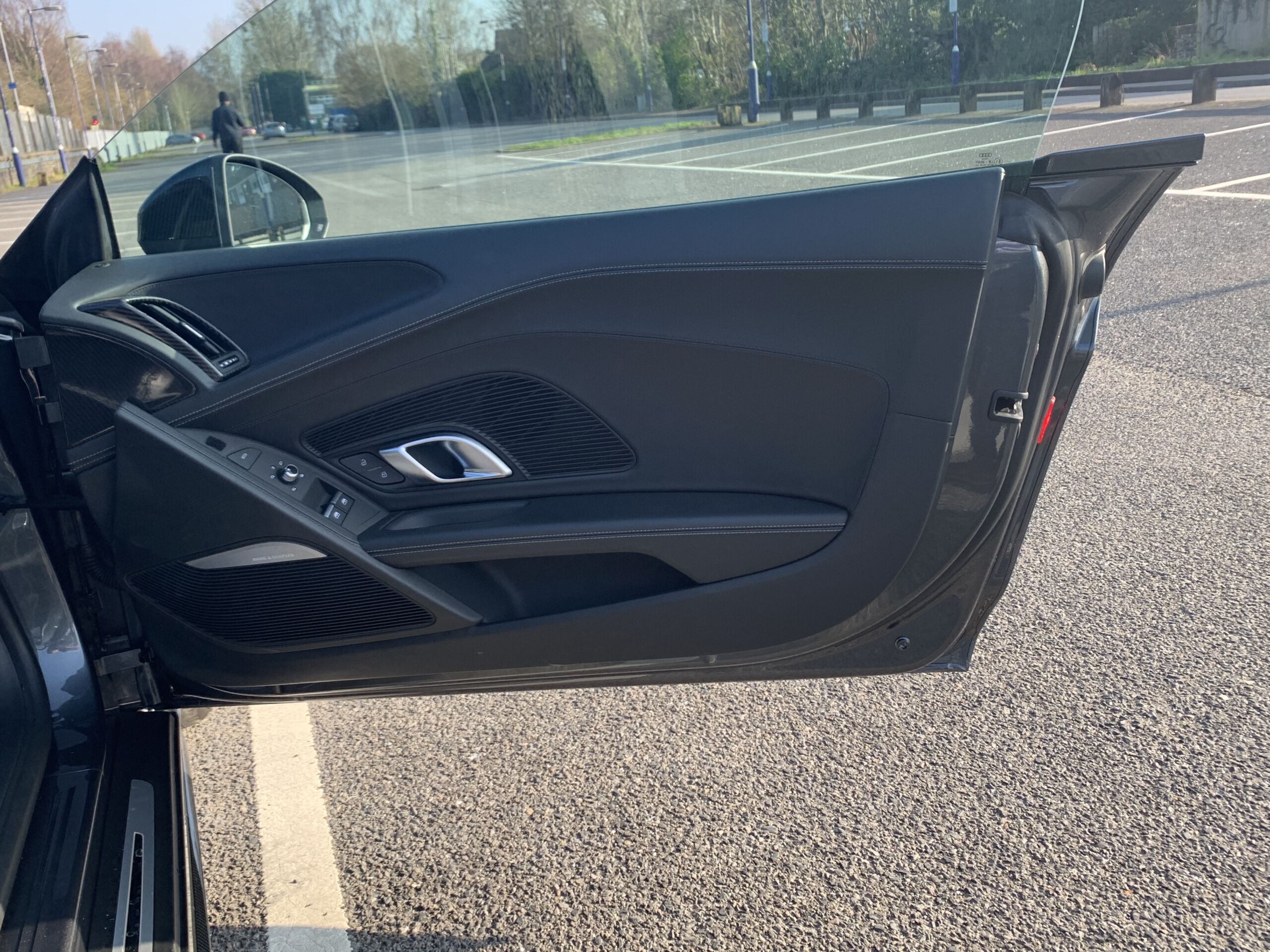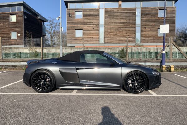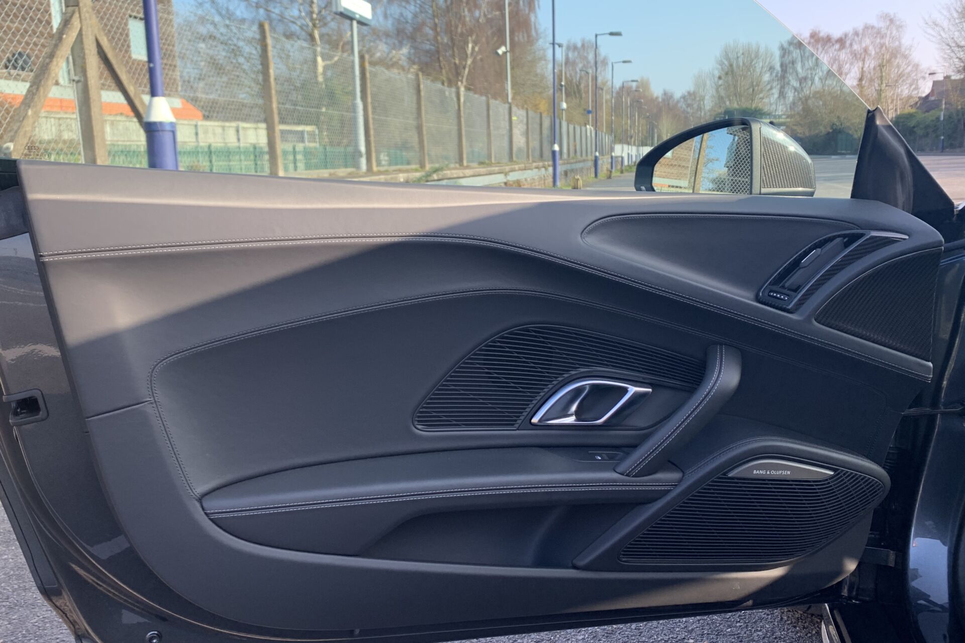 The Audi R8 V10 Plus Spyder takes everything we love about the coupe but brings you closer to the sound of that glorious V10. With a fully electric retractable soft top roof the Spyder quickly transforms itself in around 20 seconds revealing a large vent adorned rear deck, hiding the monstrous engine beneath. This particular car is swathed in carbon fibre which offsets the beautiful Daytona Grey paintwork, and there is a full PPF wrap on the car which will the paint looking fabulous. The Spyder also benefits from a retractable glass rear window, which when the hood is down acts as a brilliant wind deflector keeping buffeting in the cabin to a minimum allowing the Bang and Olufsen sound system to add to the visceral experience.