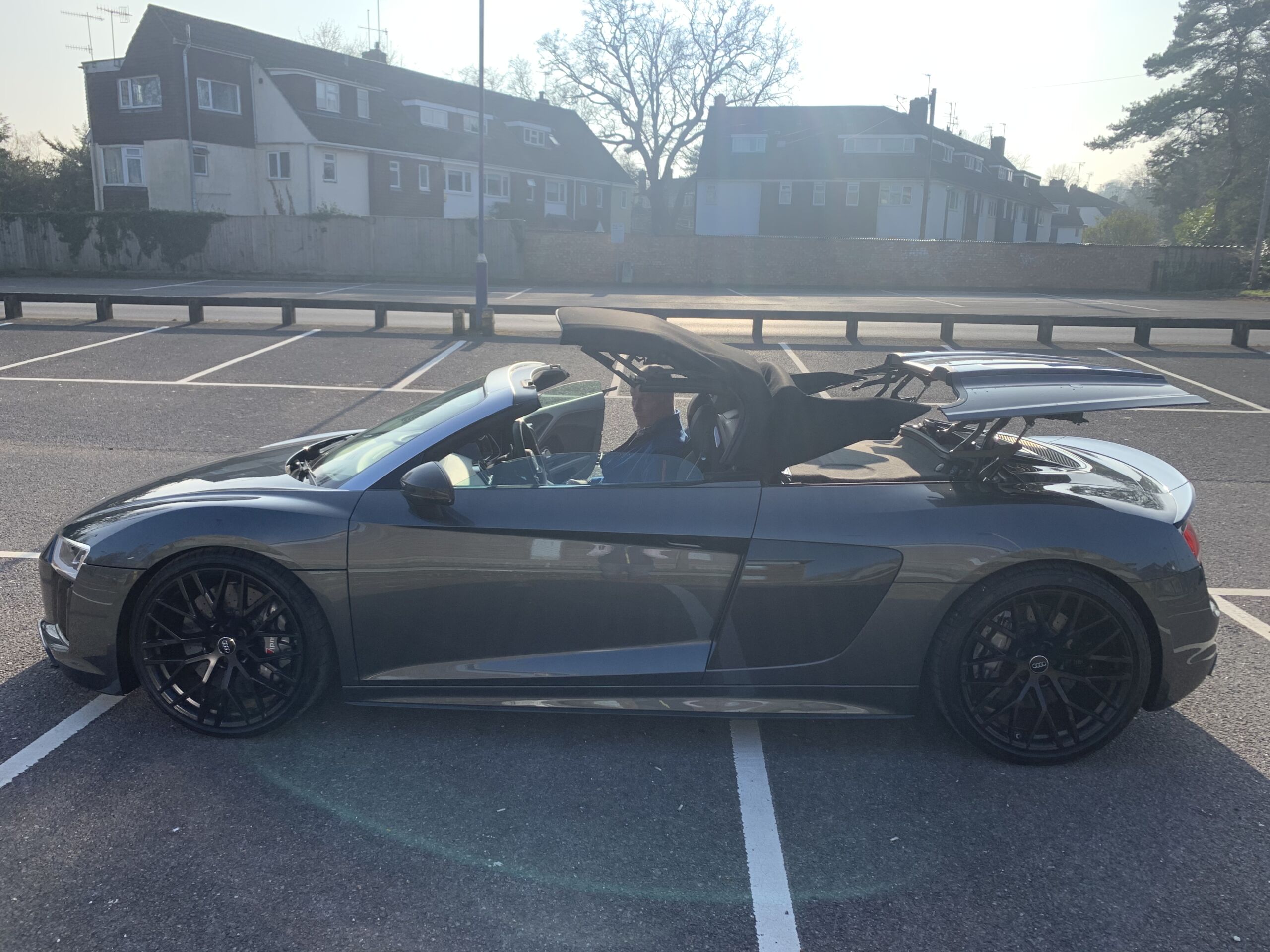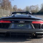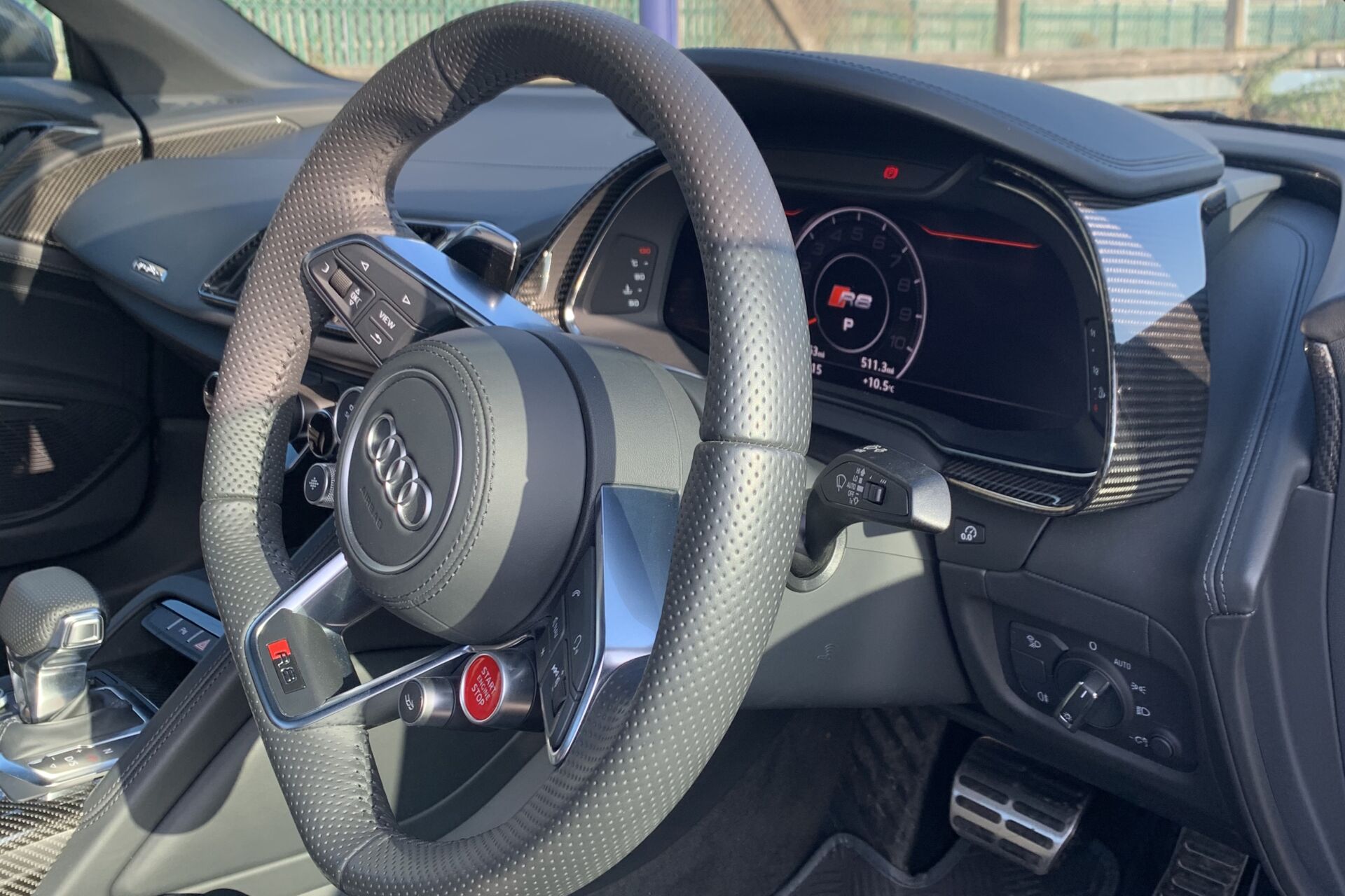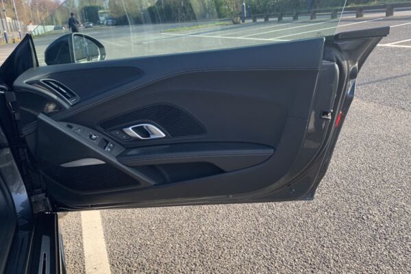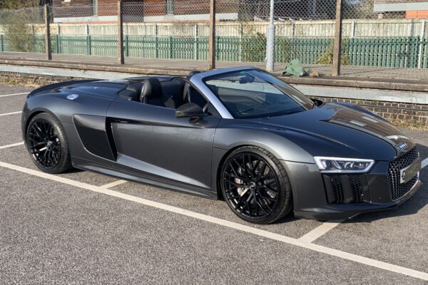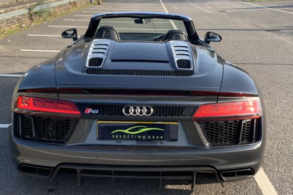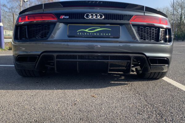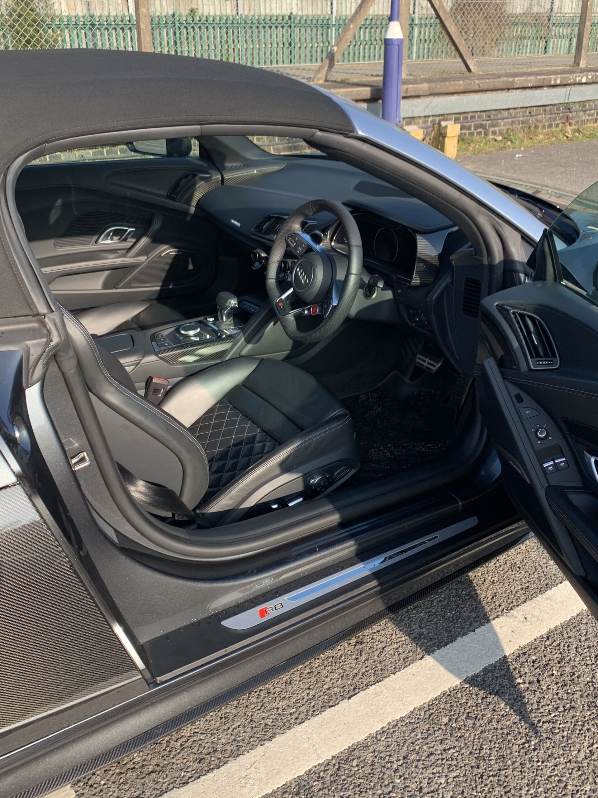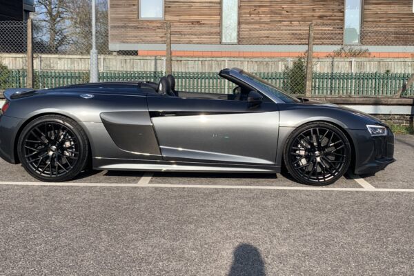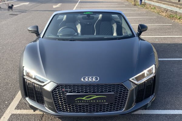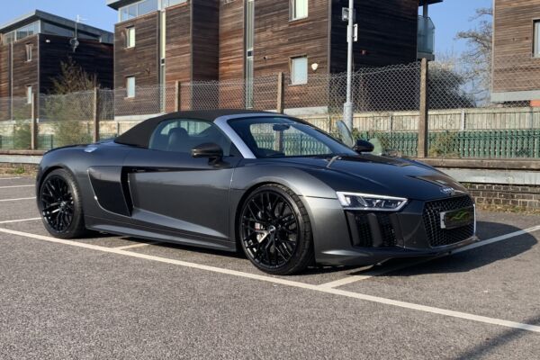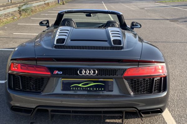 The Audi R8 V10 Plus Spyder takes everything we love about the coupe but brings you closer to the sound of that glorious V10. With a fully electric retractable soft top roof the Spyder quickly transforms itself in around 20 seconds revealing a large vent adorned rear deck, hiding the monstrous engine beneath. This particular car is swathed in carbon fibre which offsets the beautiful Daytona Grey paintwork, and there is a full PPF wrap on the car which will the paint looking fabulous. The Spyder also benefits from a retractable glass rear window, which when the hood is down acts as a brilliant wind deflector keeping buffeting in the cabin to a minimum allowing the Bang and Olufsen sound system to add to the visceral experience.