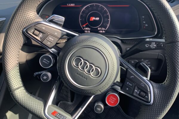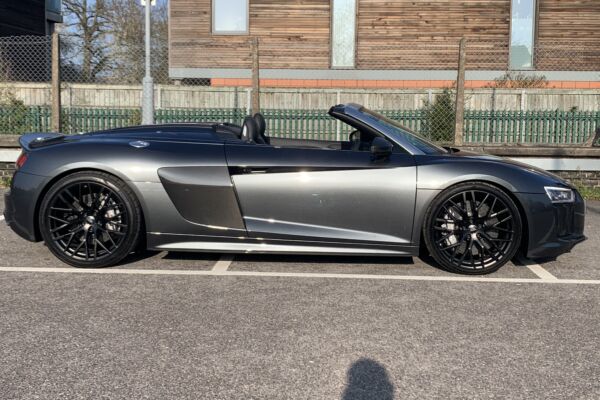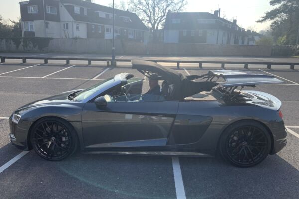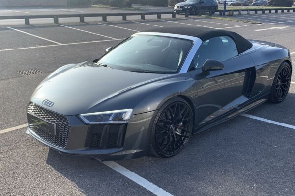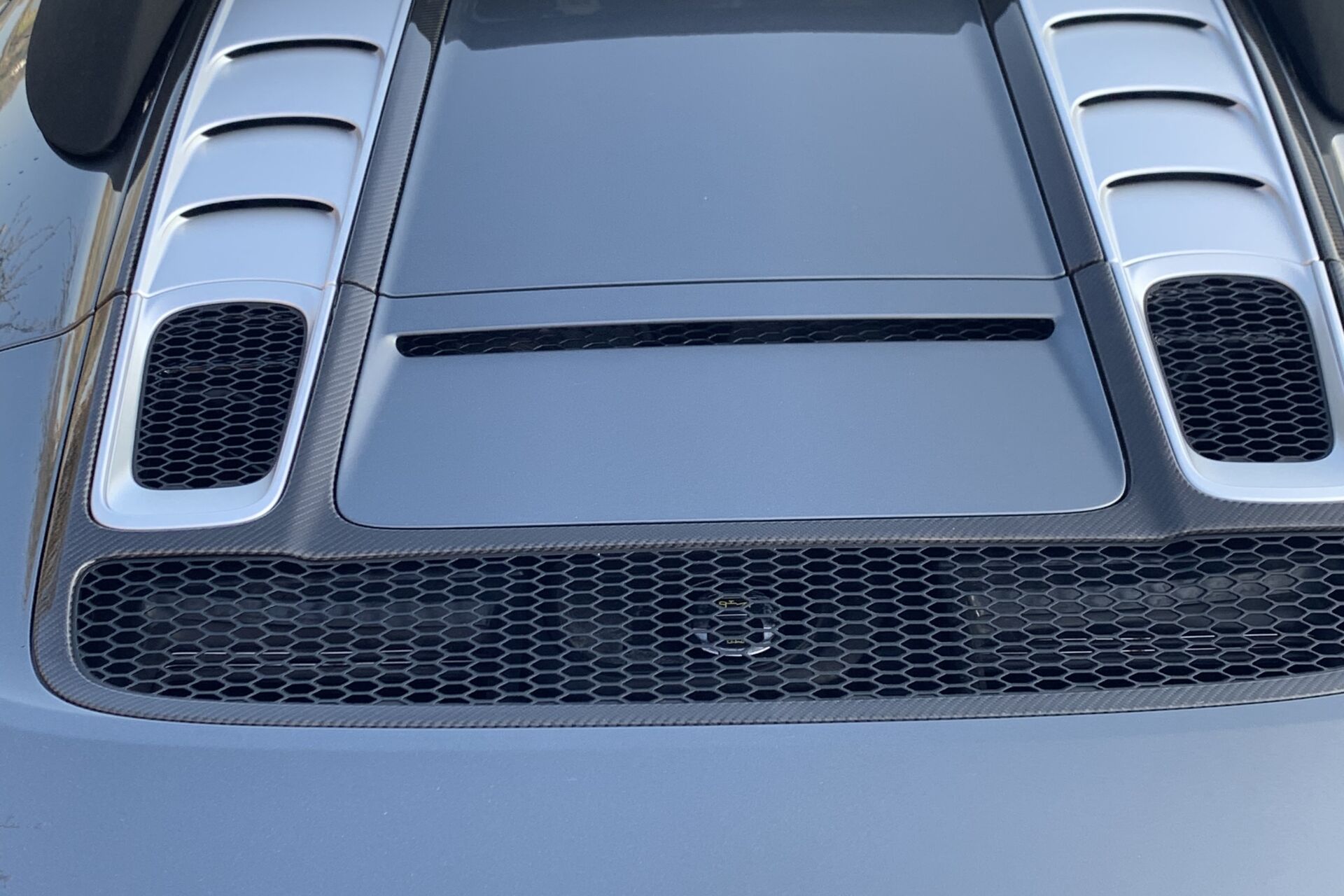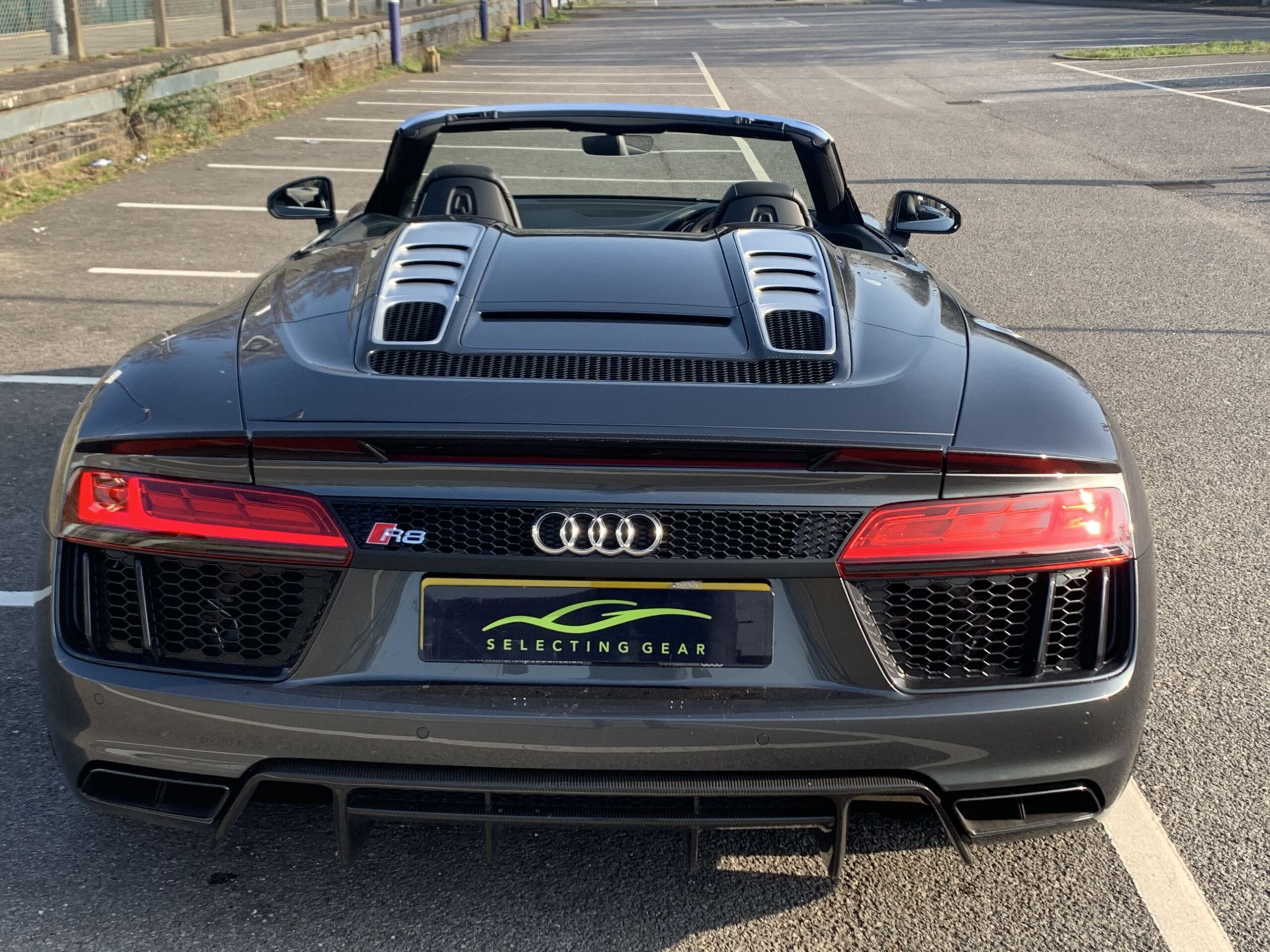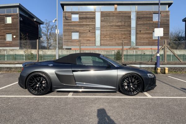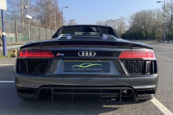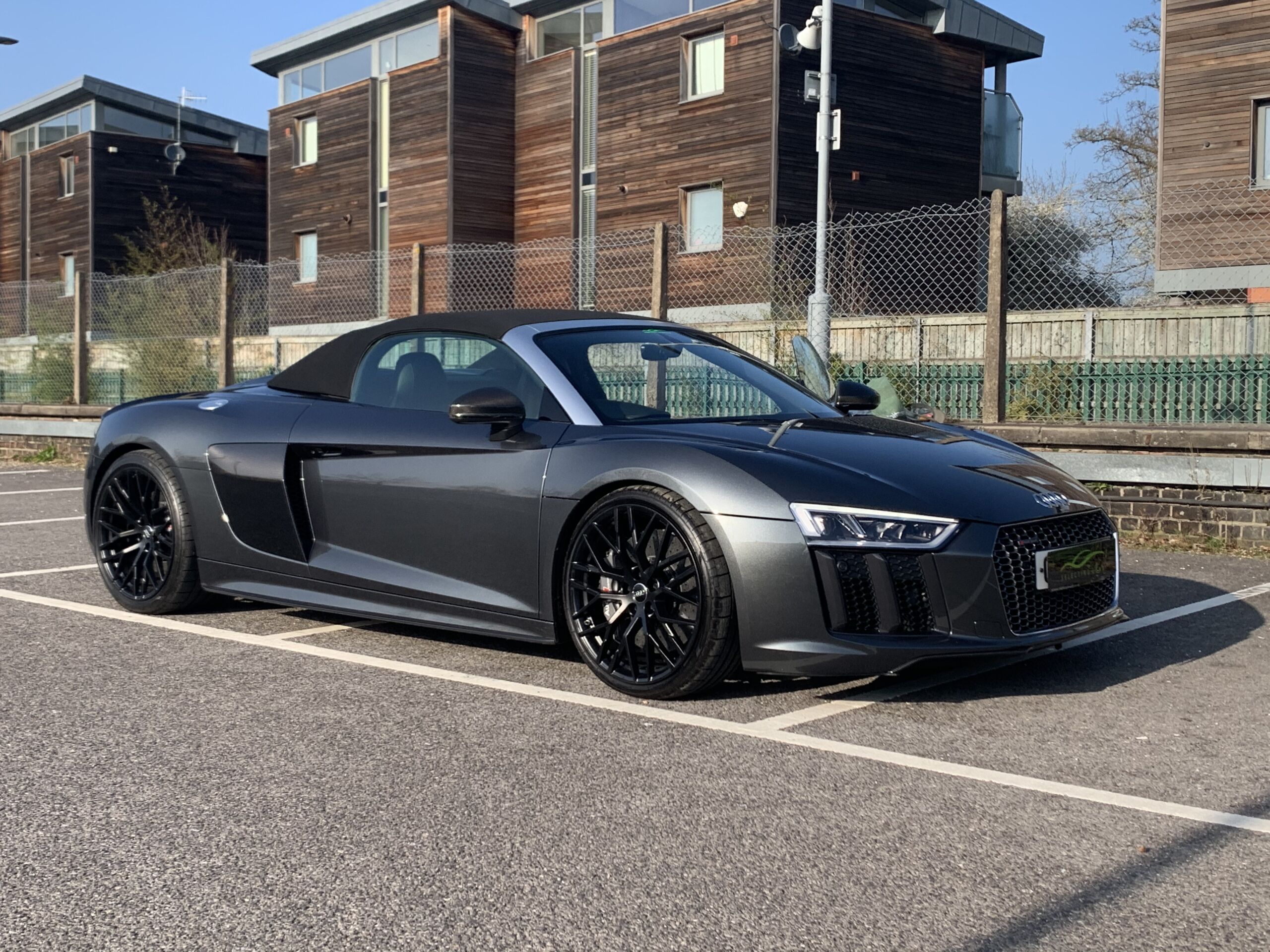 The Audi R8 V10 Plus Spyder takes everything we love about the coupe but brings you closer to the sound of that glorious V10. With a fully electric retractable soft top roof the Spyder quickly transforms itself in around 20 seconds revealing a large vent adorned rear deck, hiding the monstrous engine beneath. This particular car is swathed in carbon fibre which offsets the beautiful Daytona Grey paintwork, and there is a full PPF wrap on the car which will the paint looking fabulous. The Spyder also benefits from a retractable glass rear window, which when the hood is down acts as a brilliant wind deflector keeping buffeting in the cabin to a minimum allowing the Bang and Olufsen sound system to add to the visceral experience.