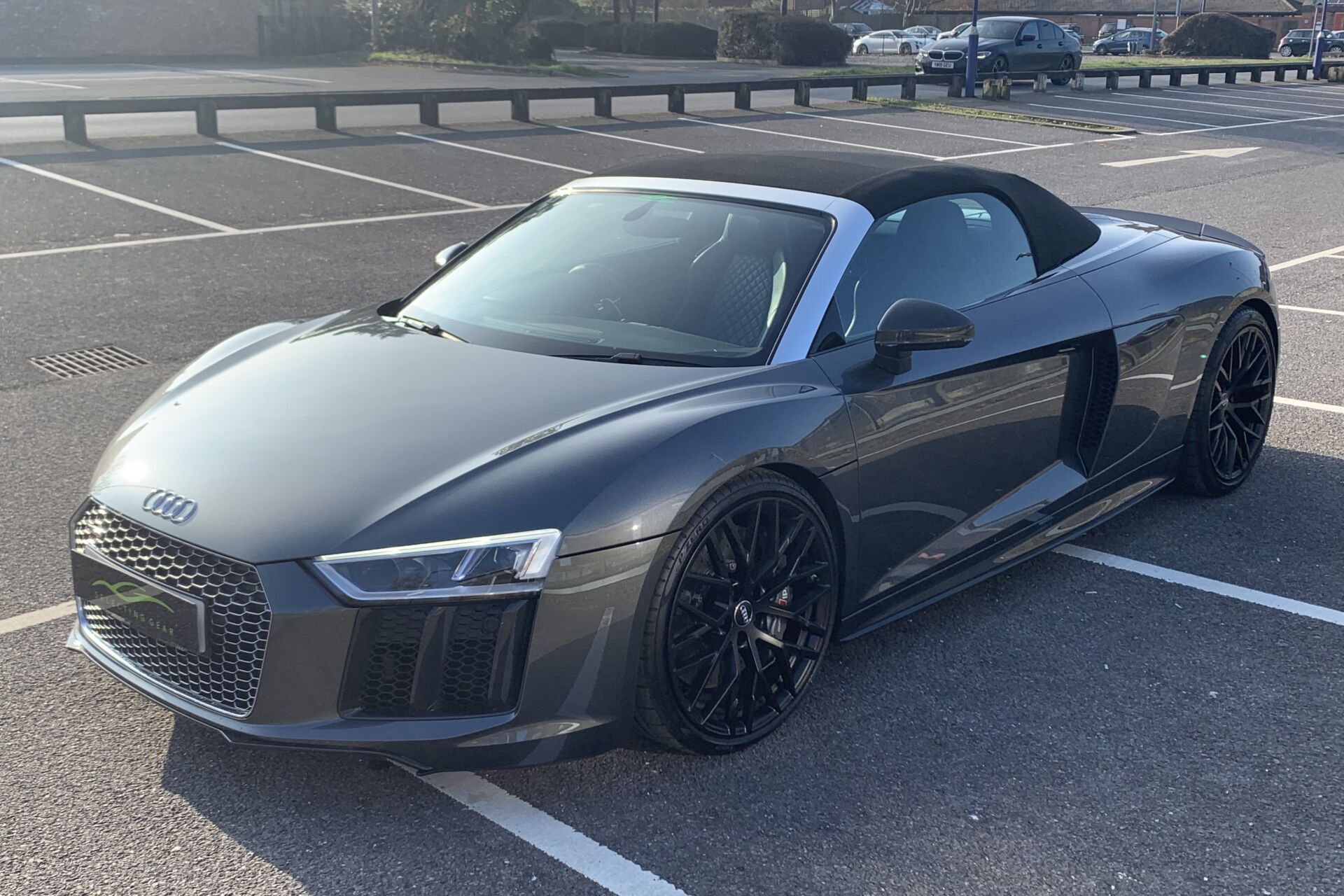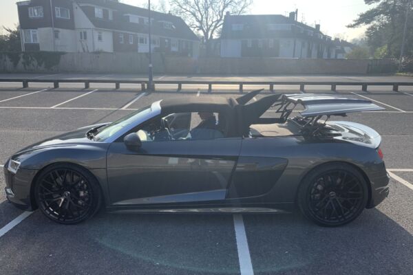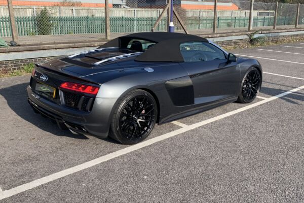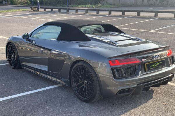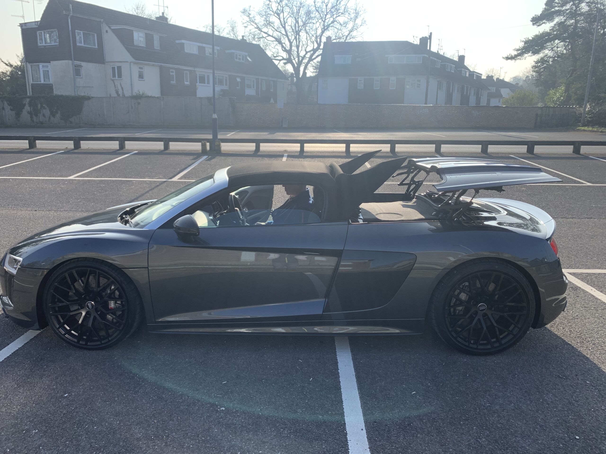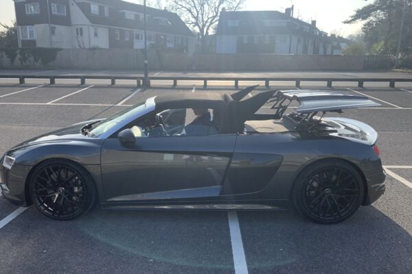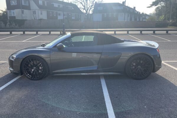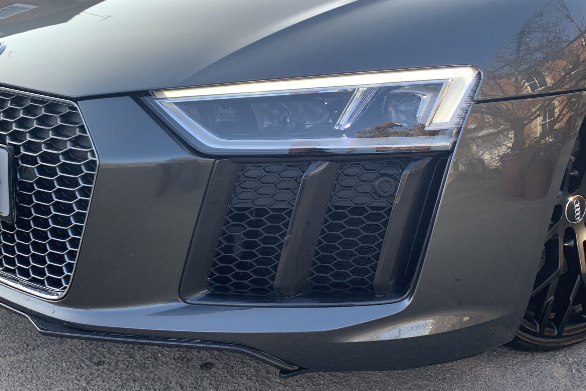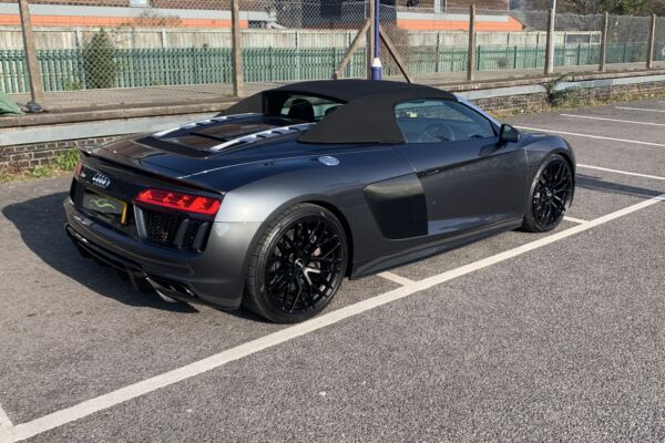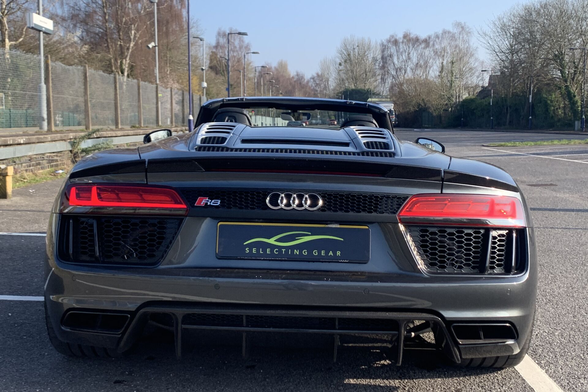 The Audi R8 V10 Plus Spyder takes everything we love about the coupe but brings you closer to the sound of that glorious V10. With a fully electric retractable soft top roof the Spyder quickly transforms itself in around 20 seconds revealing a large vent adorned rear deck, hiding the monstrous engine beneath. This particular car is swathed in carbon fibre which offsets the beautiful Daytona Grey paintwork, and there is a full PPF wrap on the car which will the paint looking fabulous. The Spyder also benefits from a retractable glass rear window, which when the hood is down acts as a brilliant wind deflector keeping buffeting in the cabin to a minimum allowing the Bang and Olufsen sound system to add to the visceral experience.