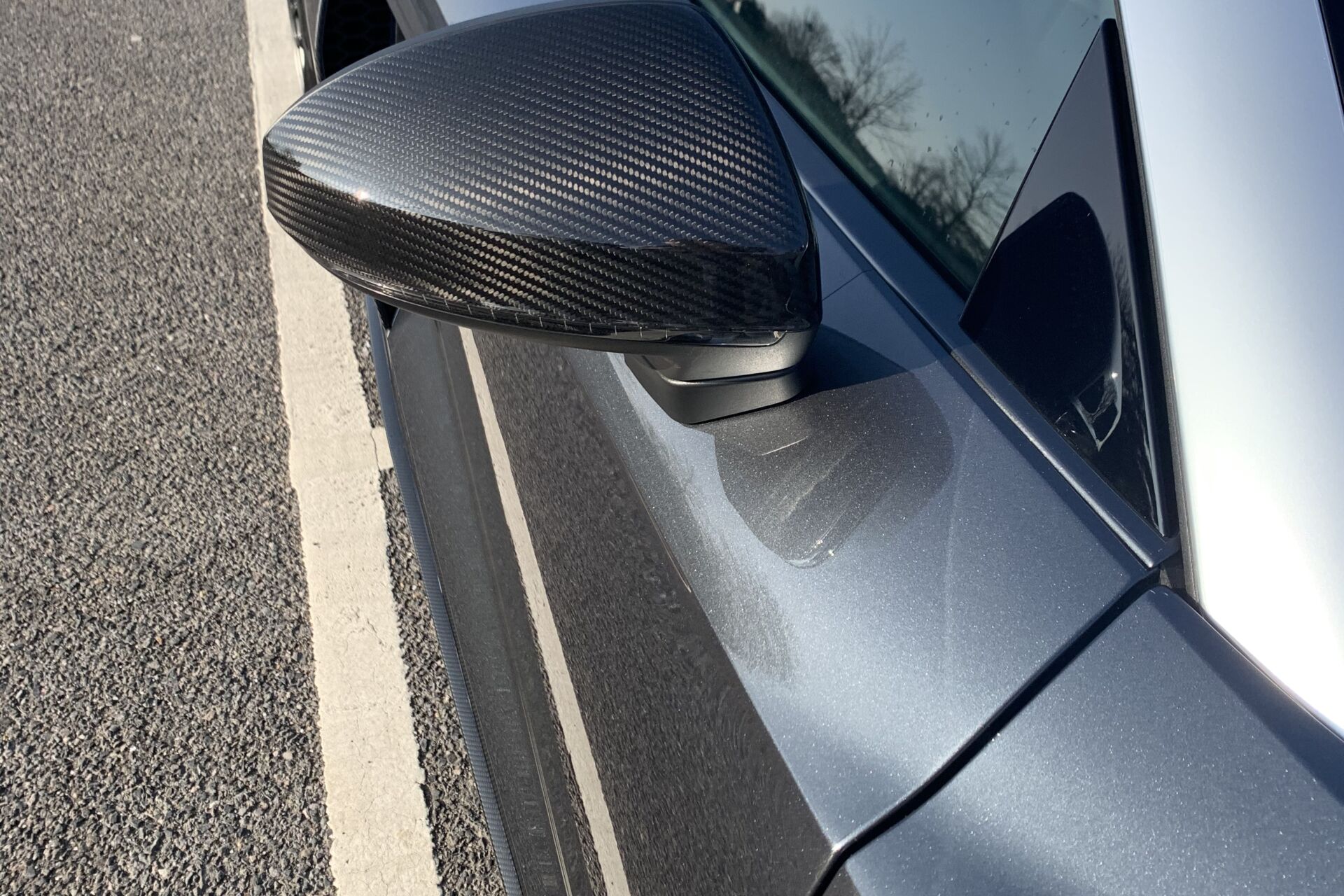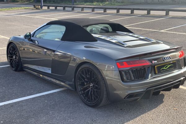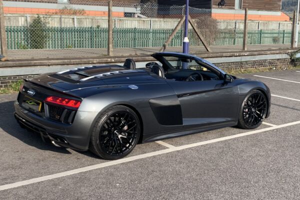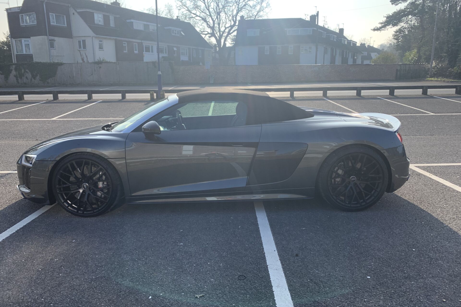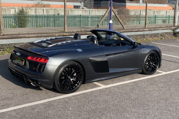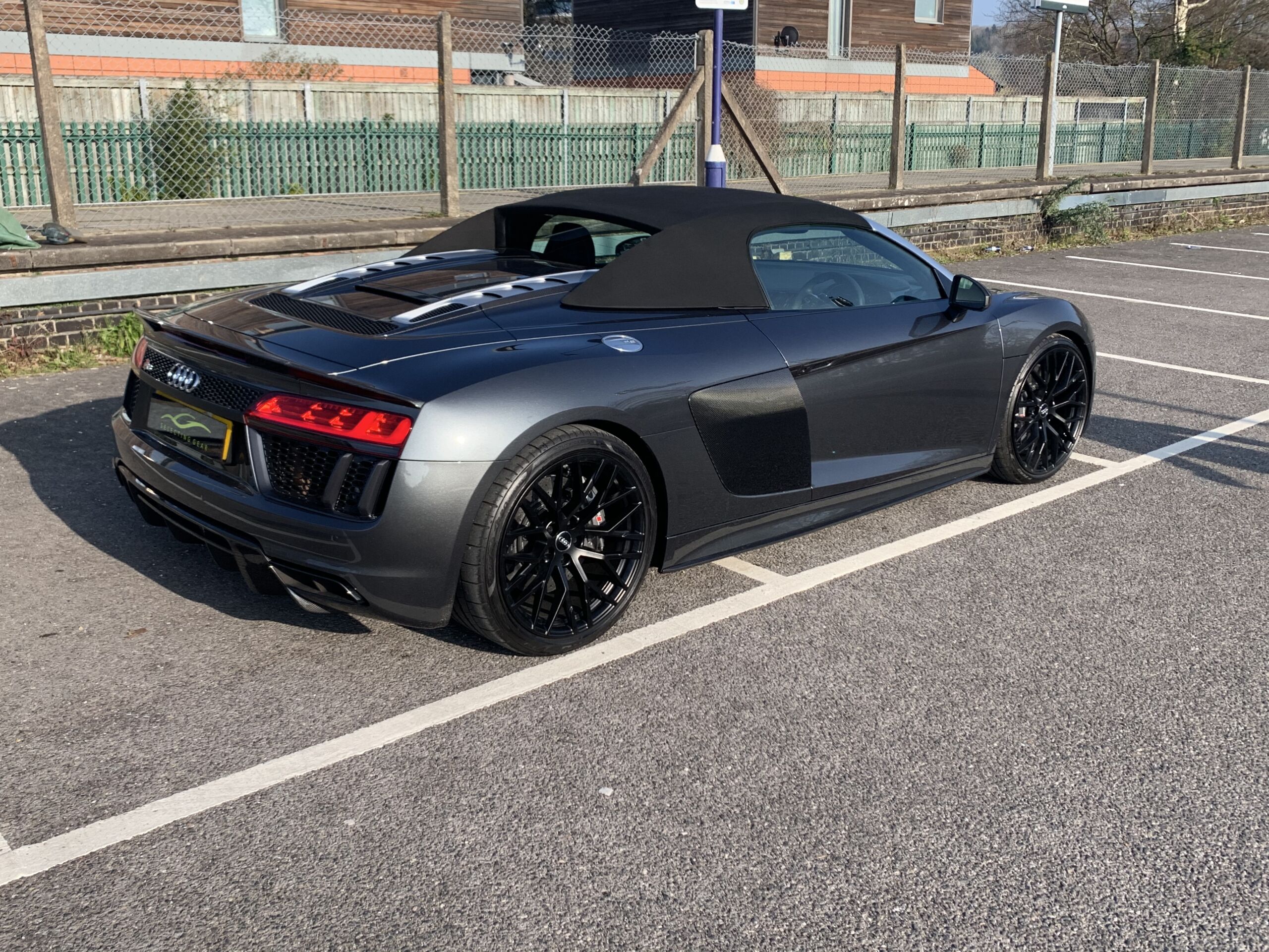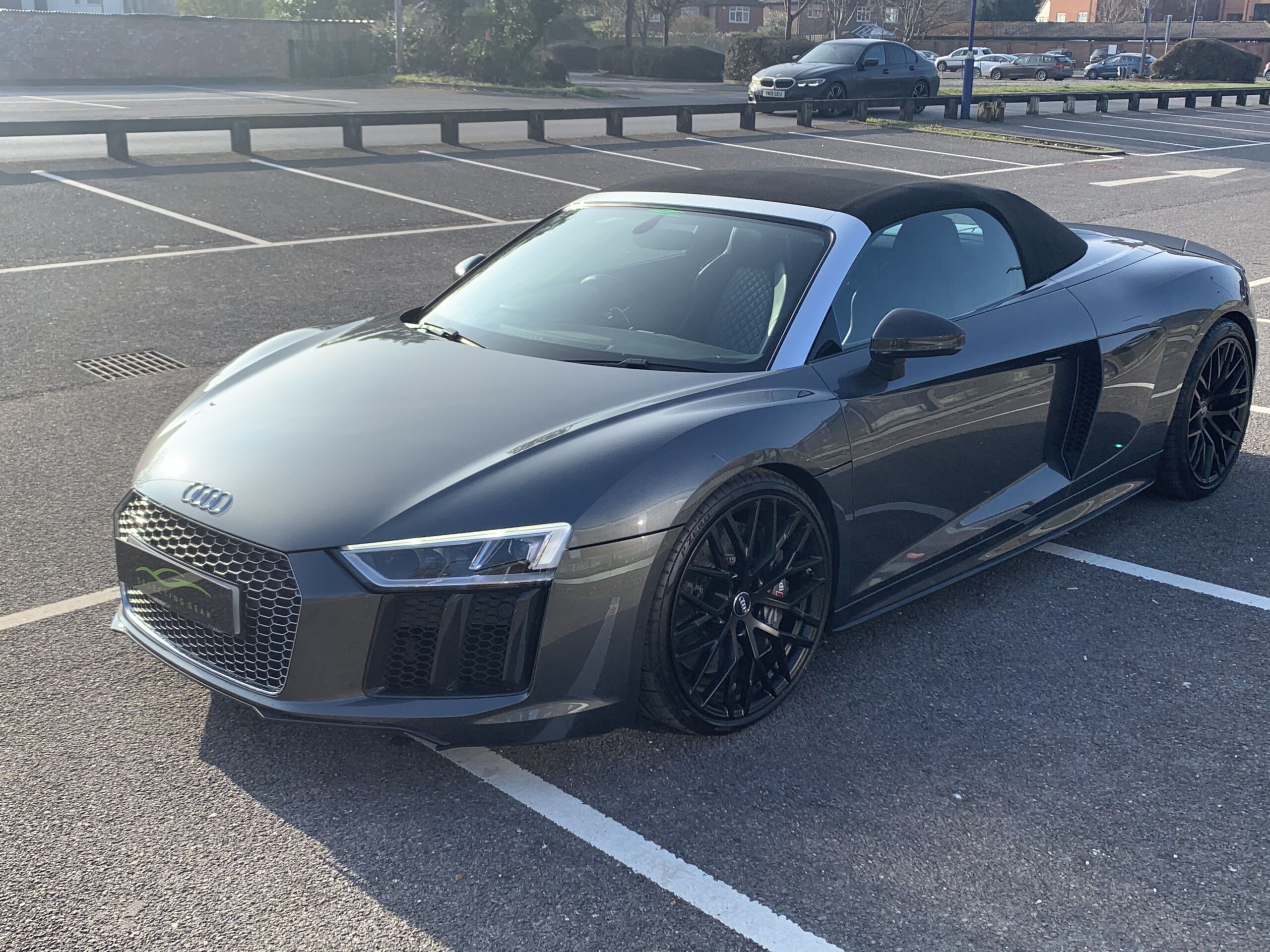 The Audi R8 V10 Plus Spyder takes everything we love about the coupe but brings you closer to the sound of that glorious V10. With a fully electric retractable soft top roof the Spyder quickly transforms itself in around 20 seconds revealing a large vent adorned rear deck, hiding the monstrous engine beneath. This particular car is swathed in carbon fibre which offsets the beautiful Daytona Grey paintwork, and there is a full PPF wrap on the car which will the paint looking fabulous. The Spyder also benefits from a retractable glass rear window, which when the hood is down acts as a brilliant wind deflector keeping buffeting in the cabin to a minimum allowing the Bang and Olufsen sound system to add to the visceral experience.