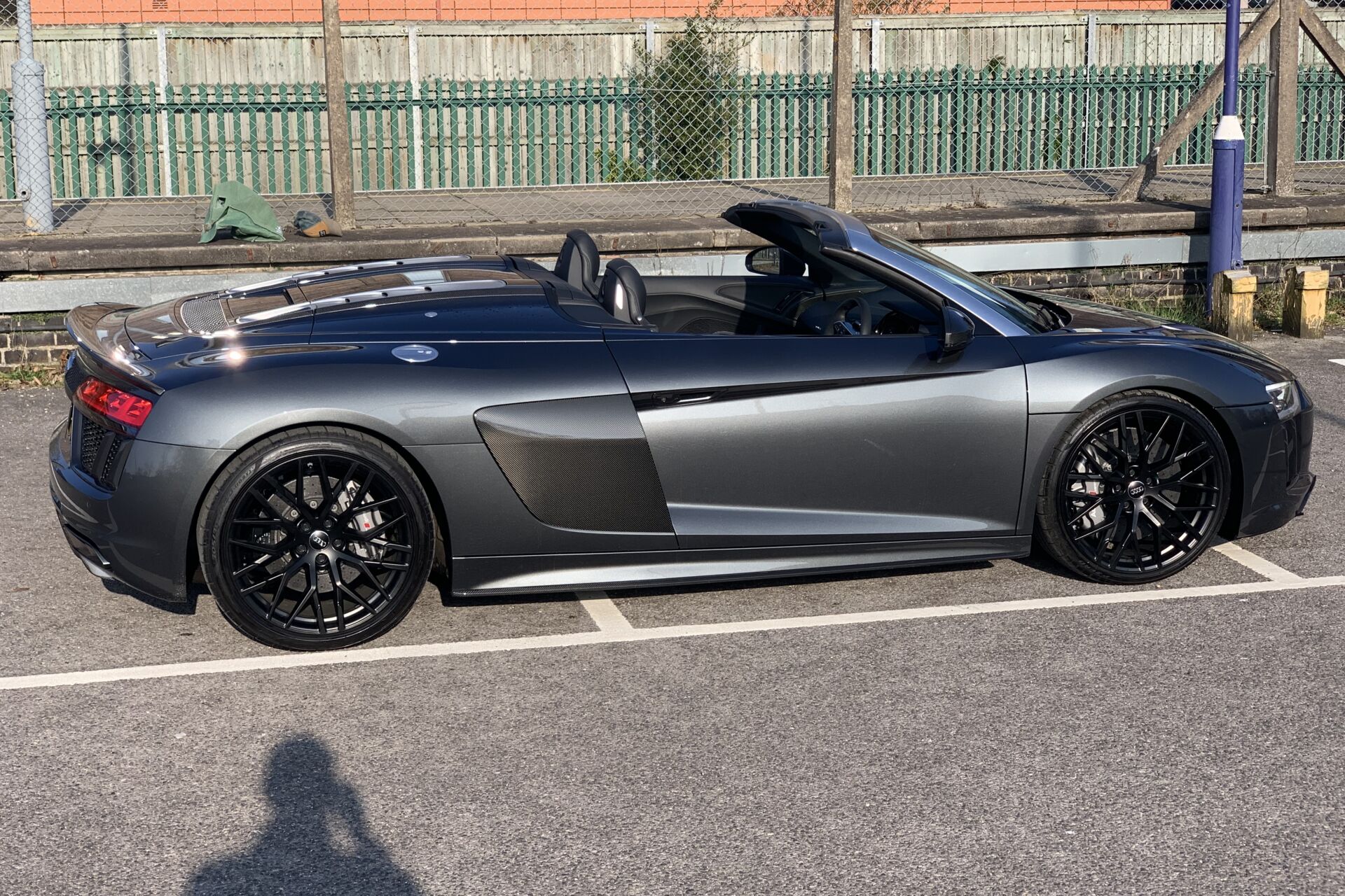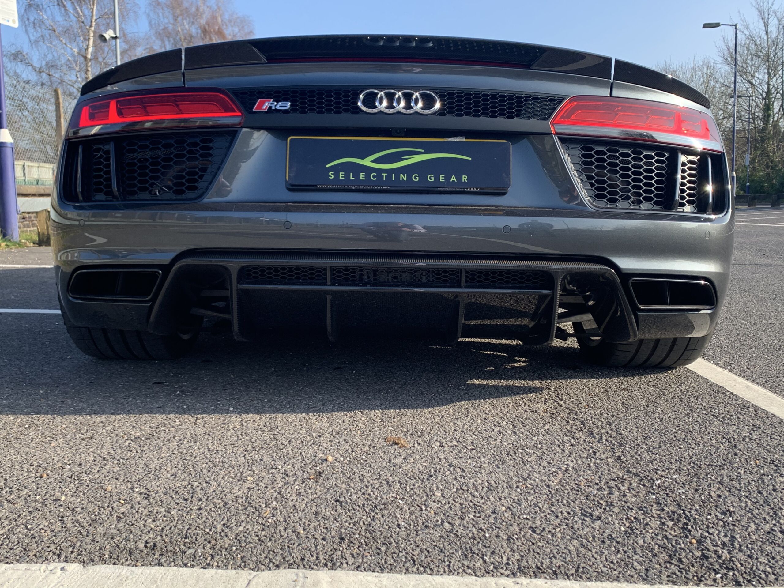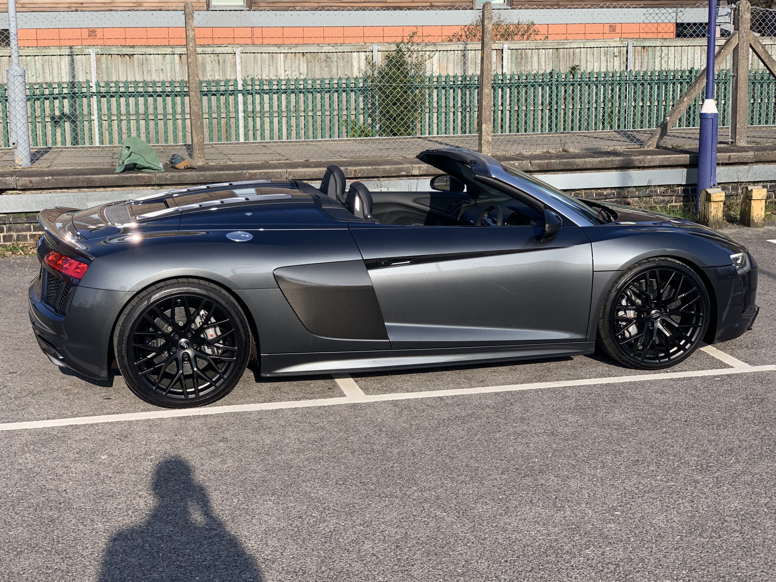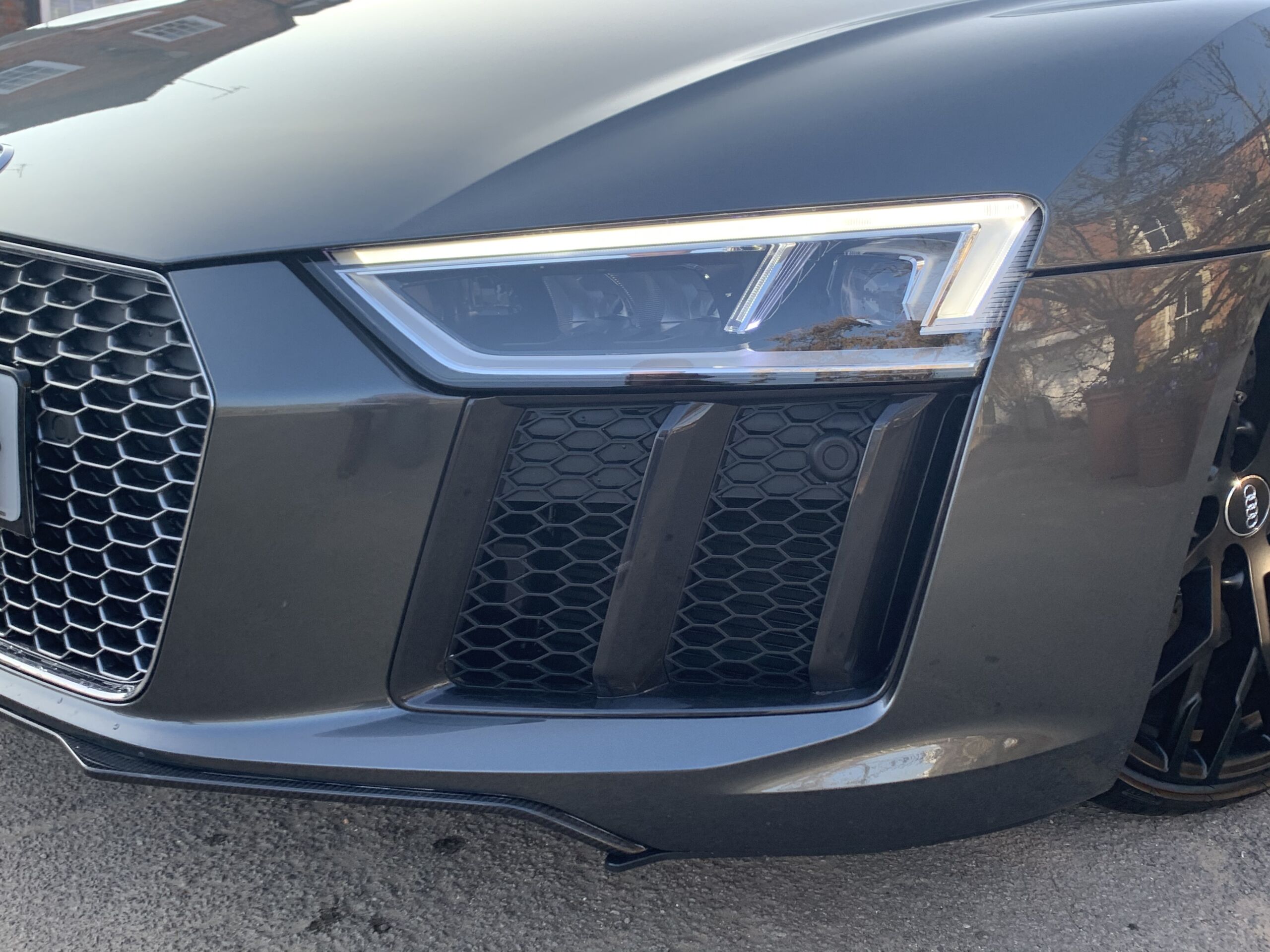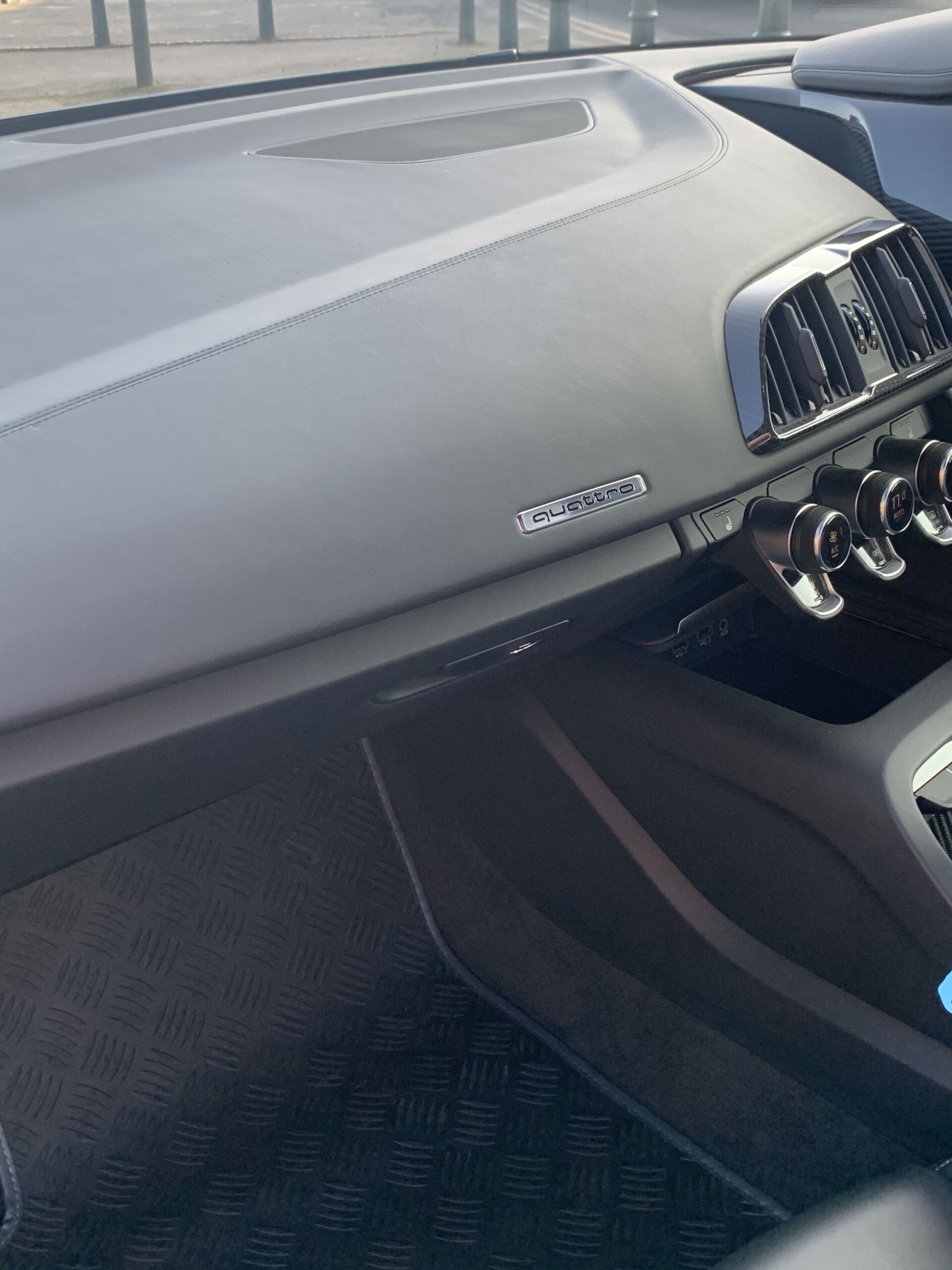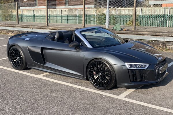 The Audi R8 V10 Plus Spyder takes everything we love about the coupe but brings you closer to the sound of that glorious V10. With a fully electric retractable soft top roof the Spyder quickly transforms itself in around 20 seconds revealing a large vent adorned rear deck, hiding the monstrous engine beneath. This particular car is swathed in carbon fibre which offsets the beautiful Daytona Grey paintwork, and there is a full PPF wrap on the car which will the paint looking fabulous. The Spyder also benefits from a retractable glass rear window, which when the hood is down acts as a brilliant wind deflector keeping buffeting in the cabin to a minimum allowing the Bang and Olufsen sound system to add to the visceral experience.