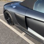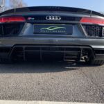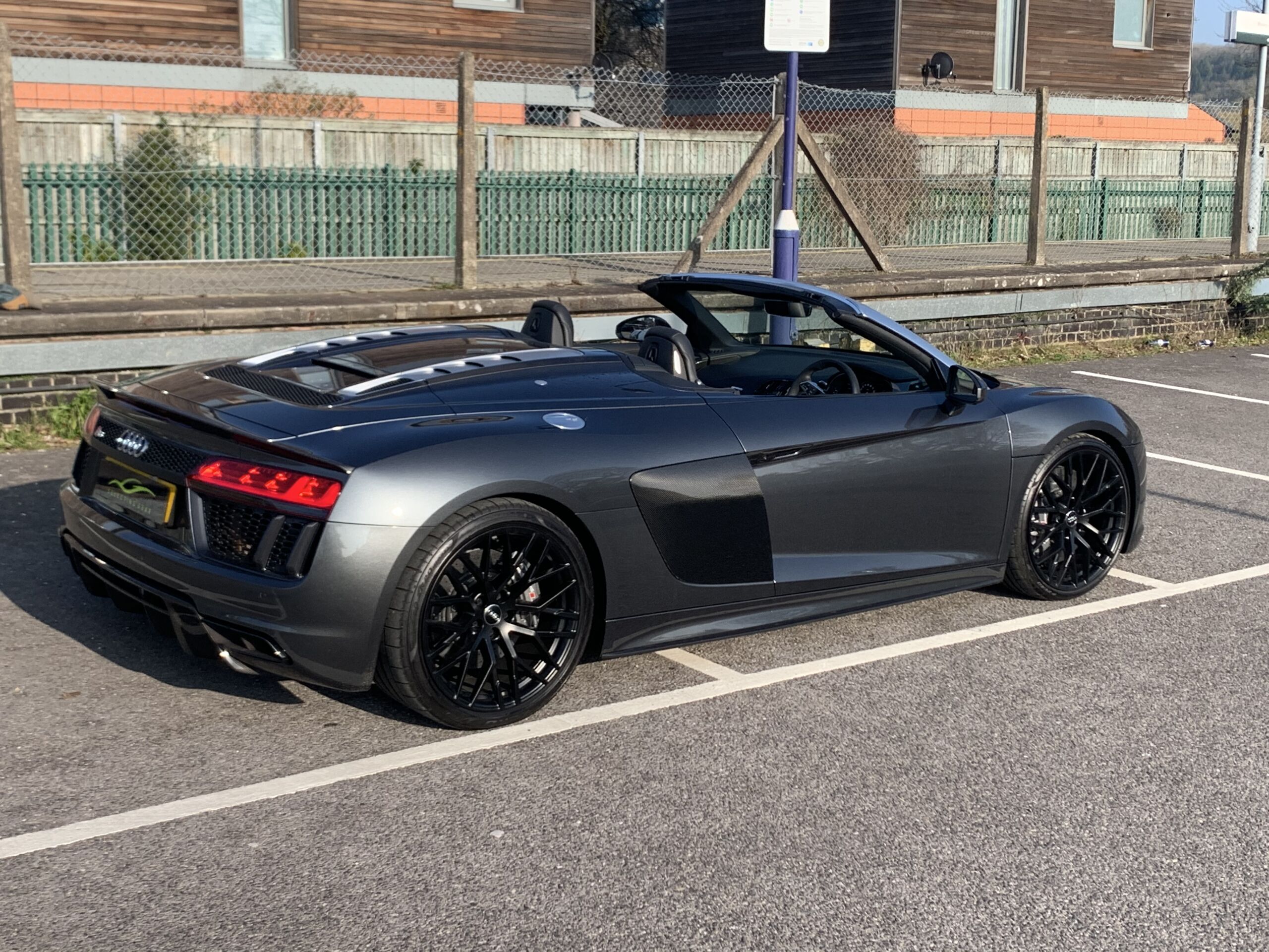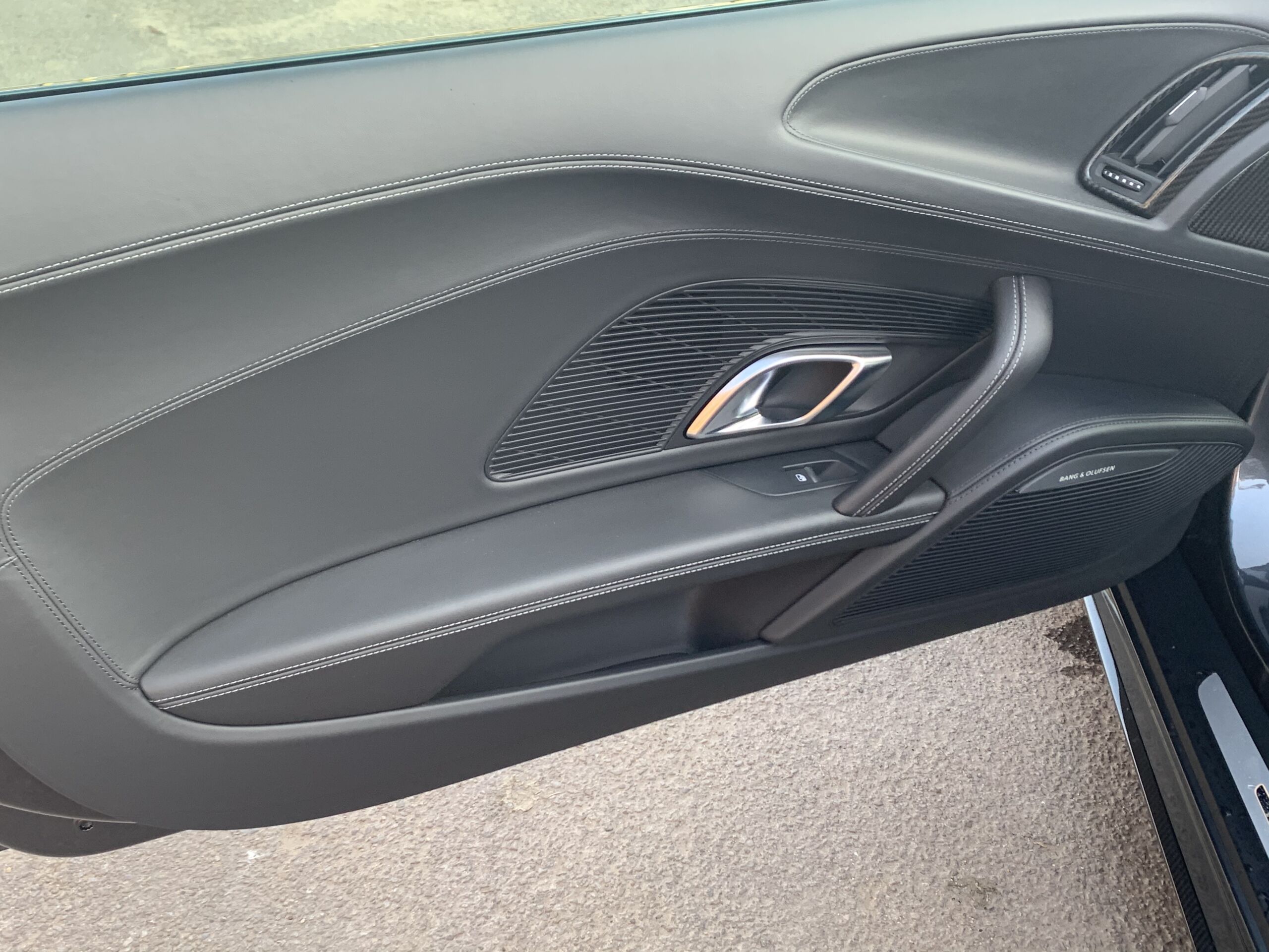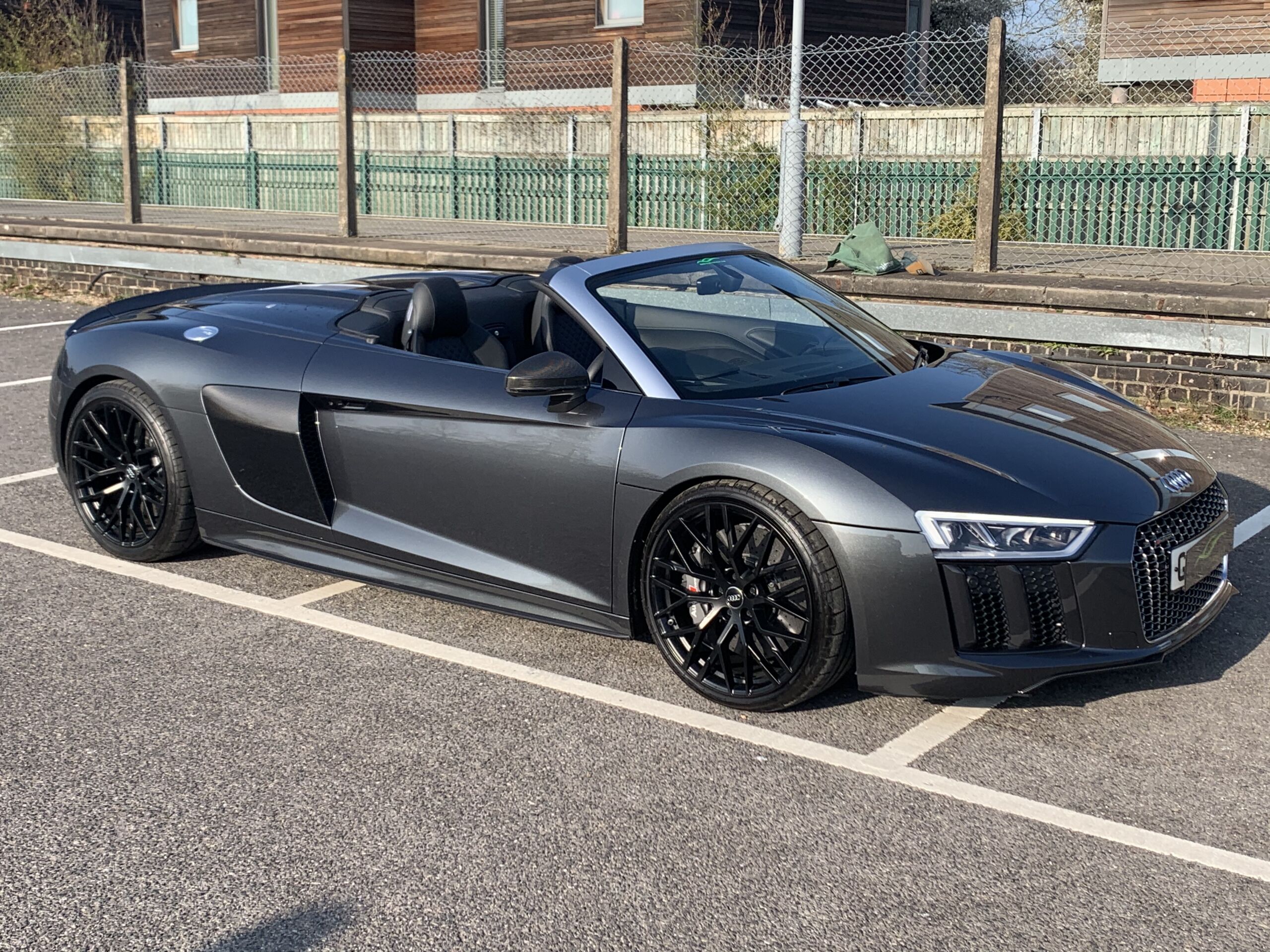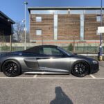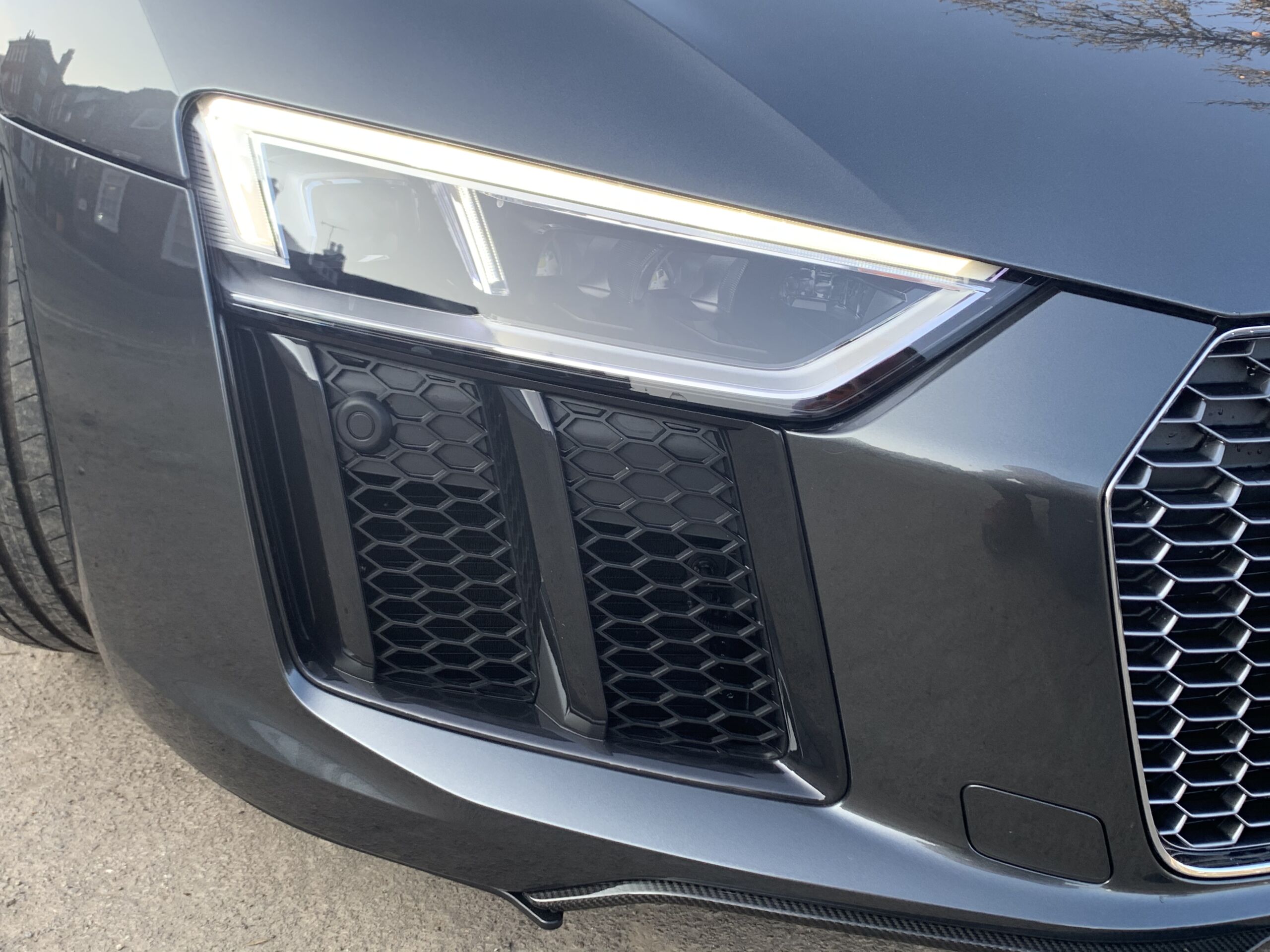 The Audi R8 V10 Plus Spyder takes everything we love about the coupe but brings you closer to the sound of that glorious V10. With a fully electric retractable soft top roof the Spyder quickly transforms itself in around 20 seconds revealing a large vent adorned rear deck, hiding the monstrous engine beneath. This particular car is swathed in carbon fibre which offsets the beautiful Daytona Grey paintwork, and there is a full PPF wrap on the car which will the paint looking fabulous. The Spyder also benefits from a retractable glass rear window, which when the hood is down acts as a brilliant wind deflector keeping buffeting in the cabin to a minimum allowing the Bang and Olufsen sound system to add to the visceral experience.