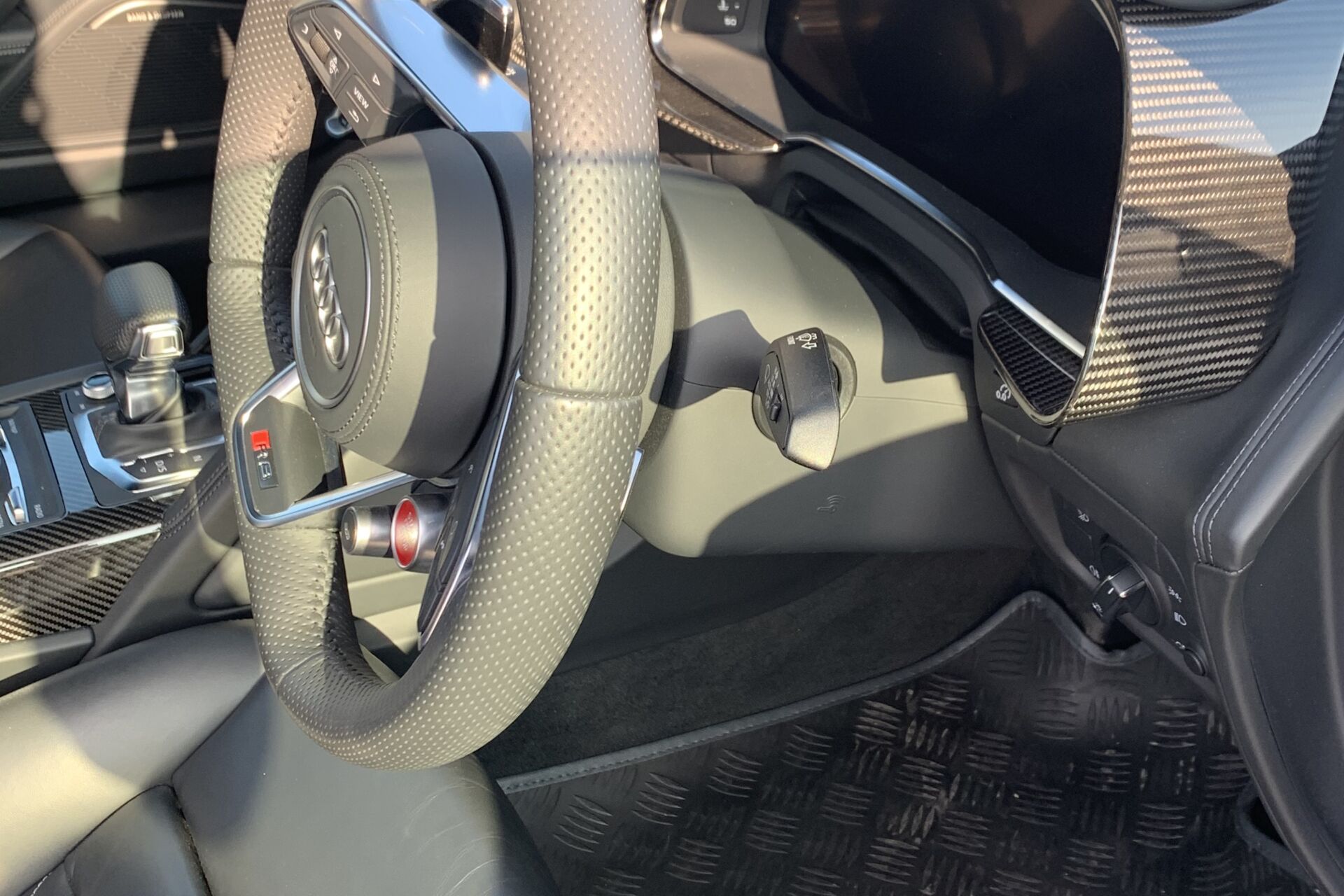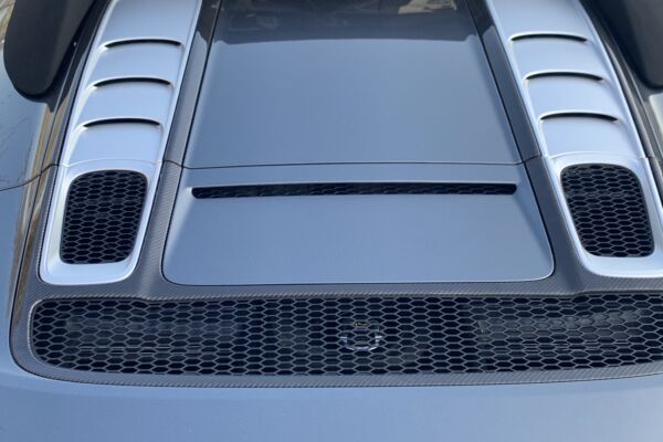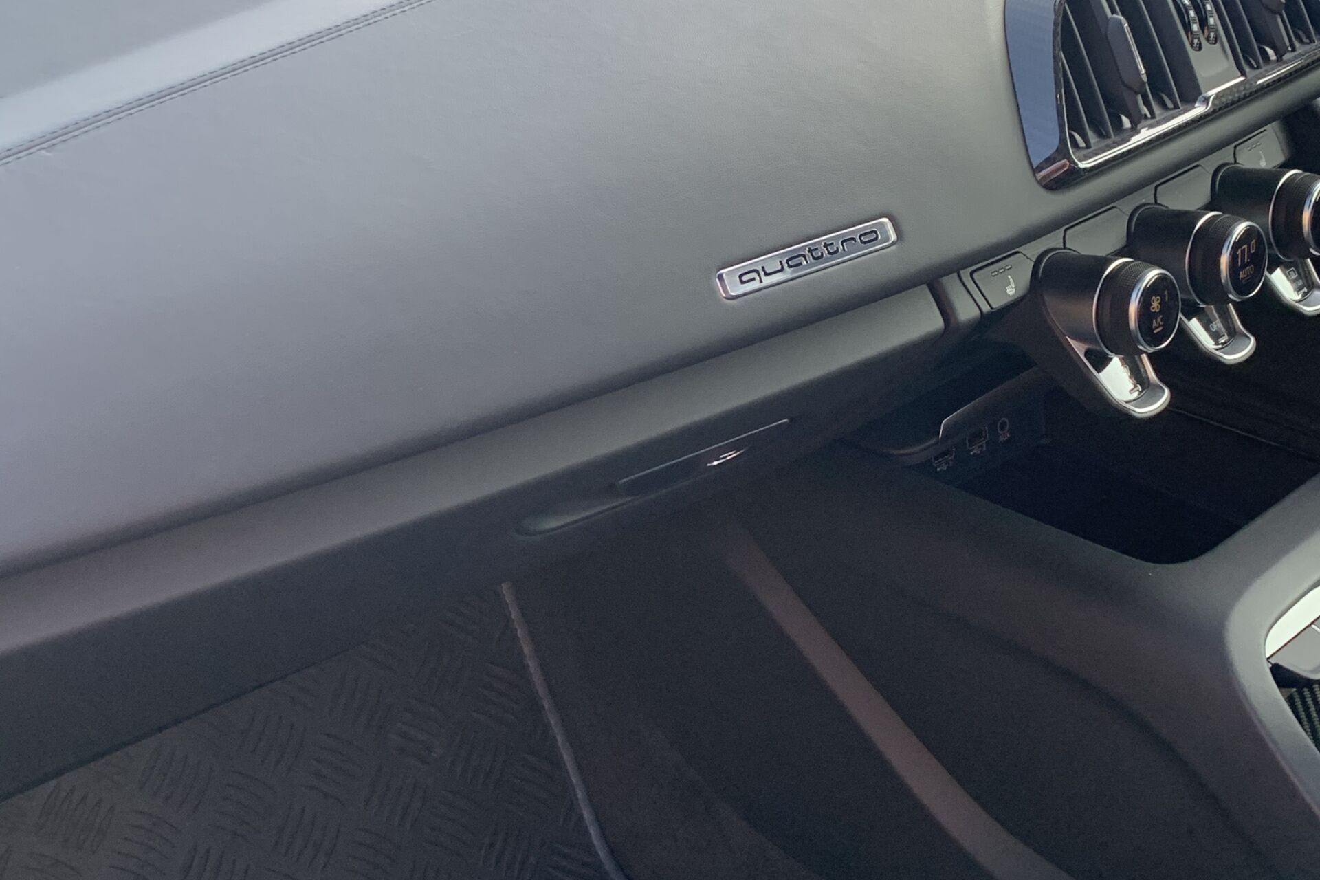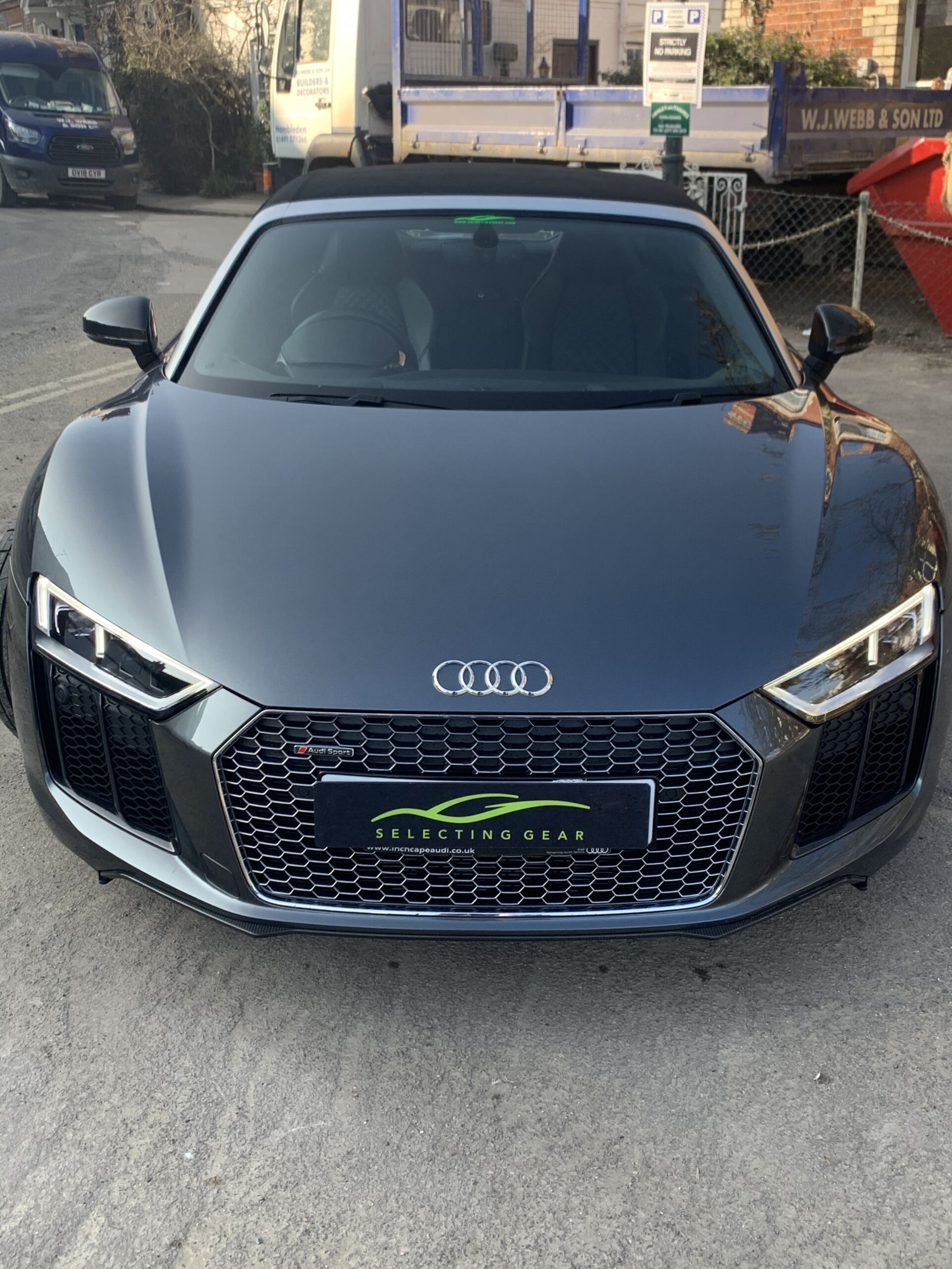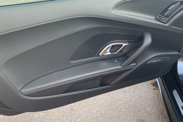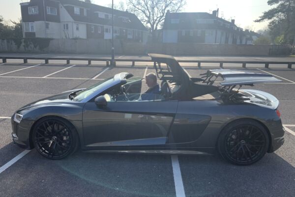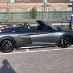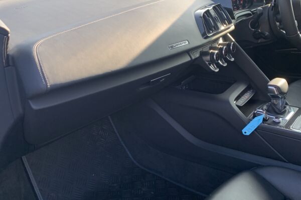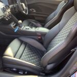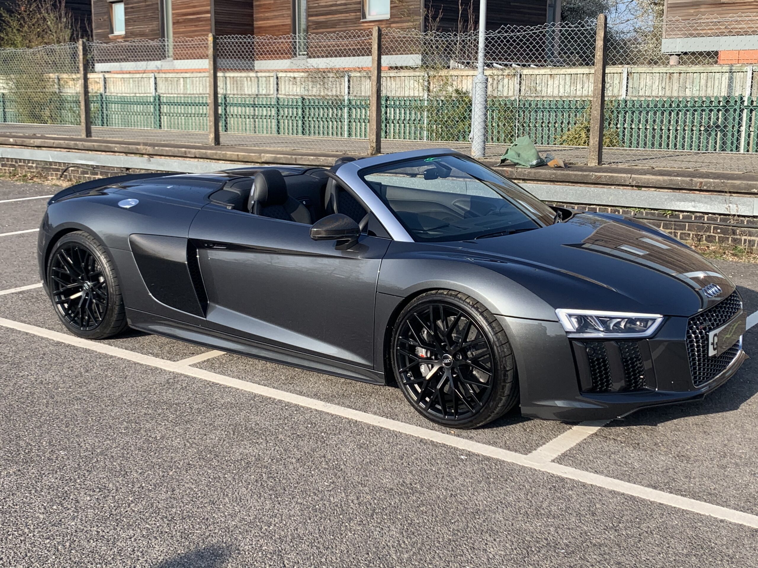 The Audi R8 V10 Plus Spyder takes everything we love about the coupe but brings you closer to the sound of that glorious V10. With a fully electric retractable soft top roof the Spyder quickly transforms itself in around 20 seconds revealing a large vent adorned rear deck, hiding the monstrous engine beneath. This particular car is swathed in carbon fibre which offsets the beautiful Daytona Grey paintwork, and there is a full PPF wrap on the car which will the paint looking fabulous. The Spyder also benefits from a retractable glass rear window, which when the hood is down acts as a brilliant wind deflector keeping buffeting in the cabin to a minimum allowing the Bang and Olufsen sound system to add to the visceral experience.