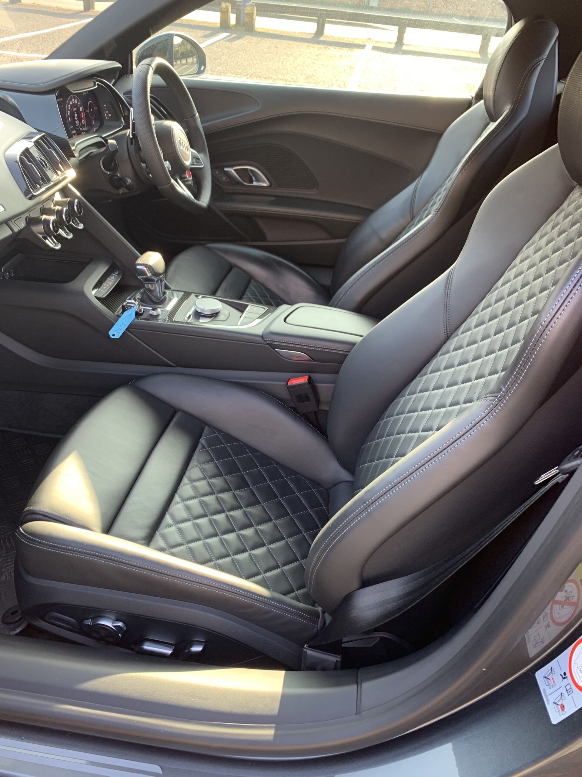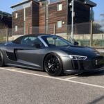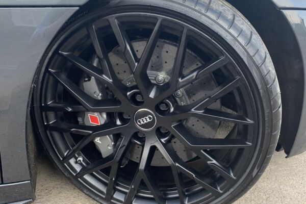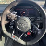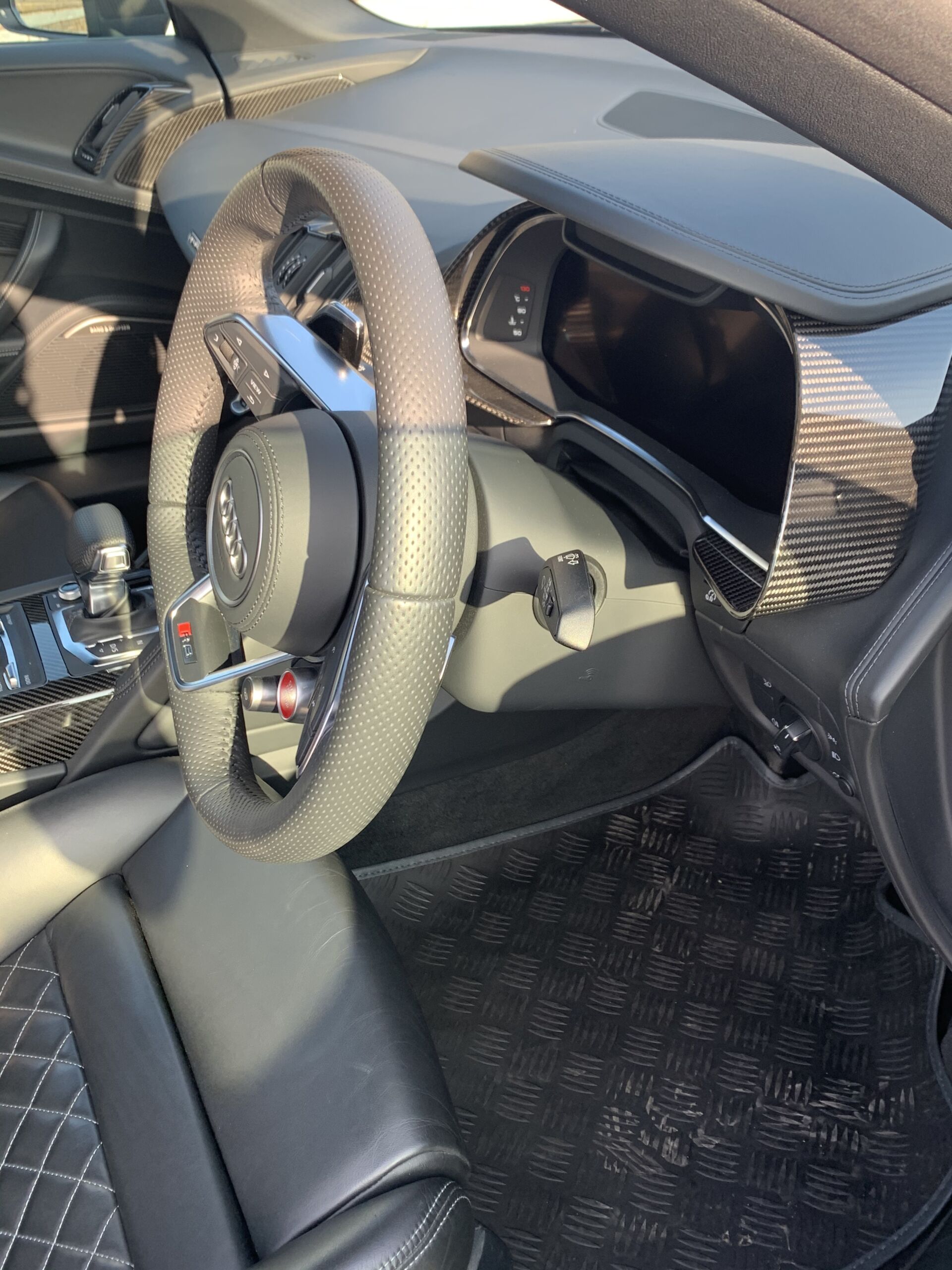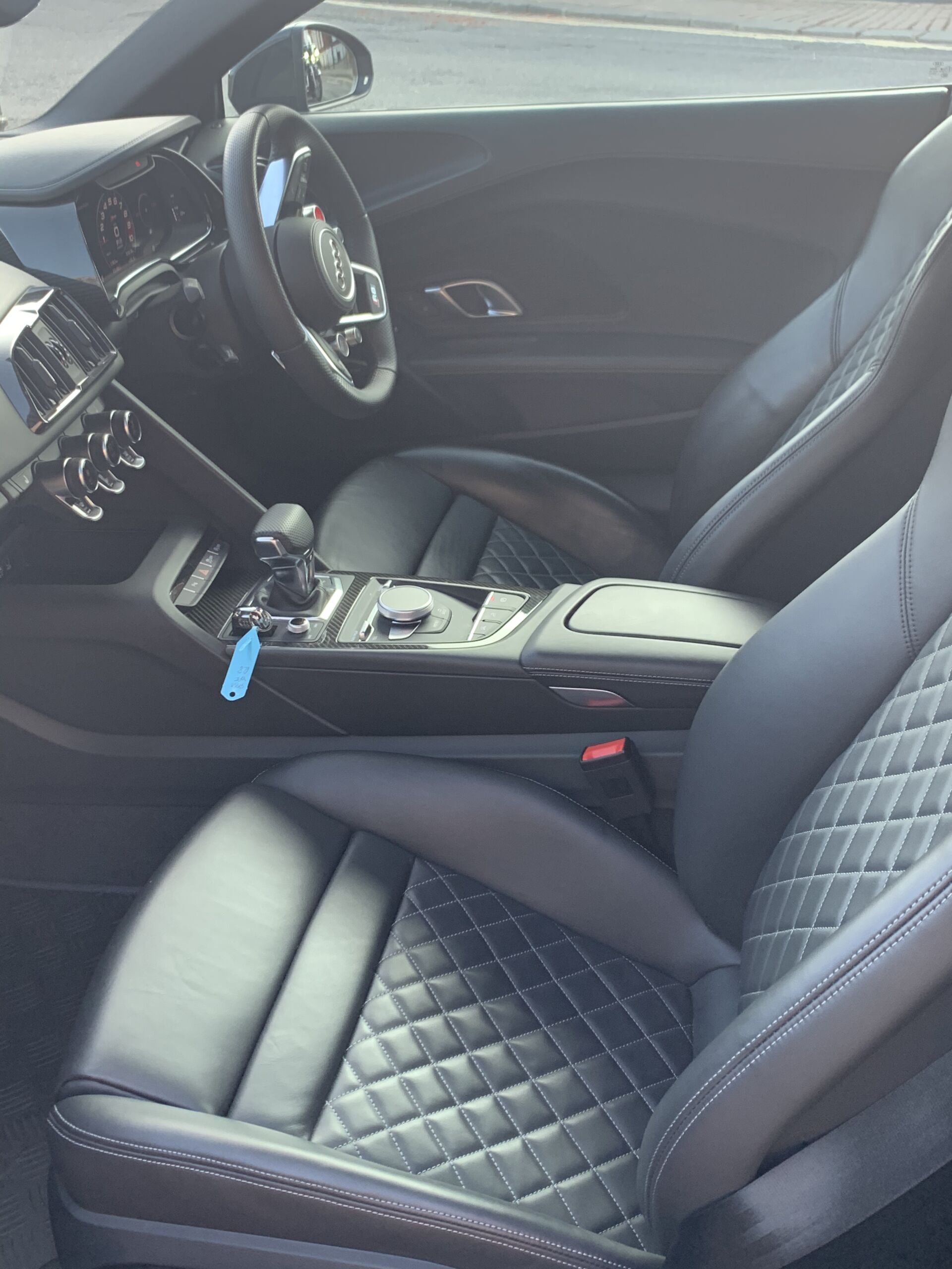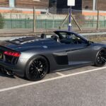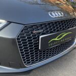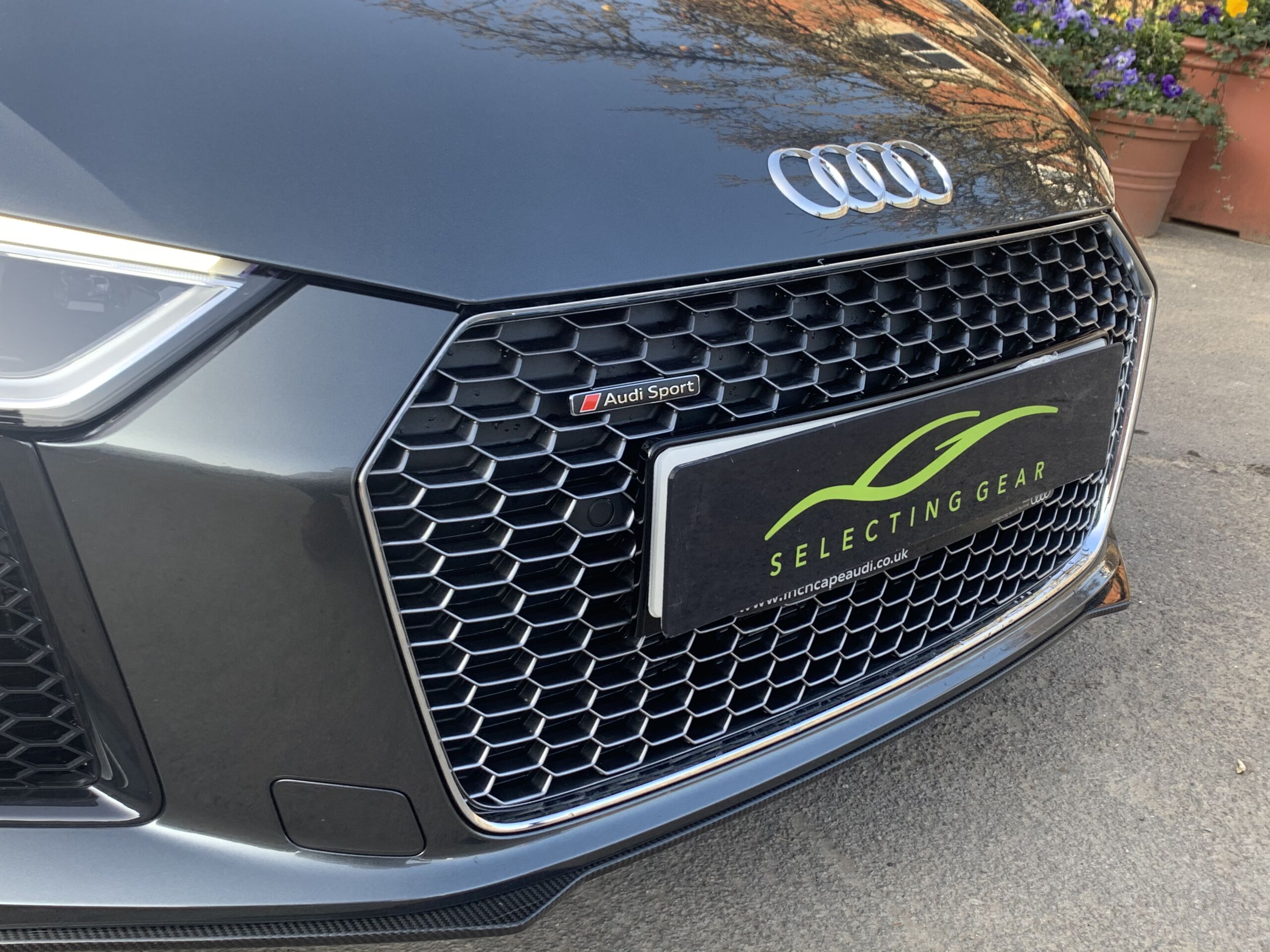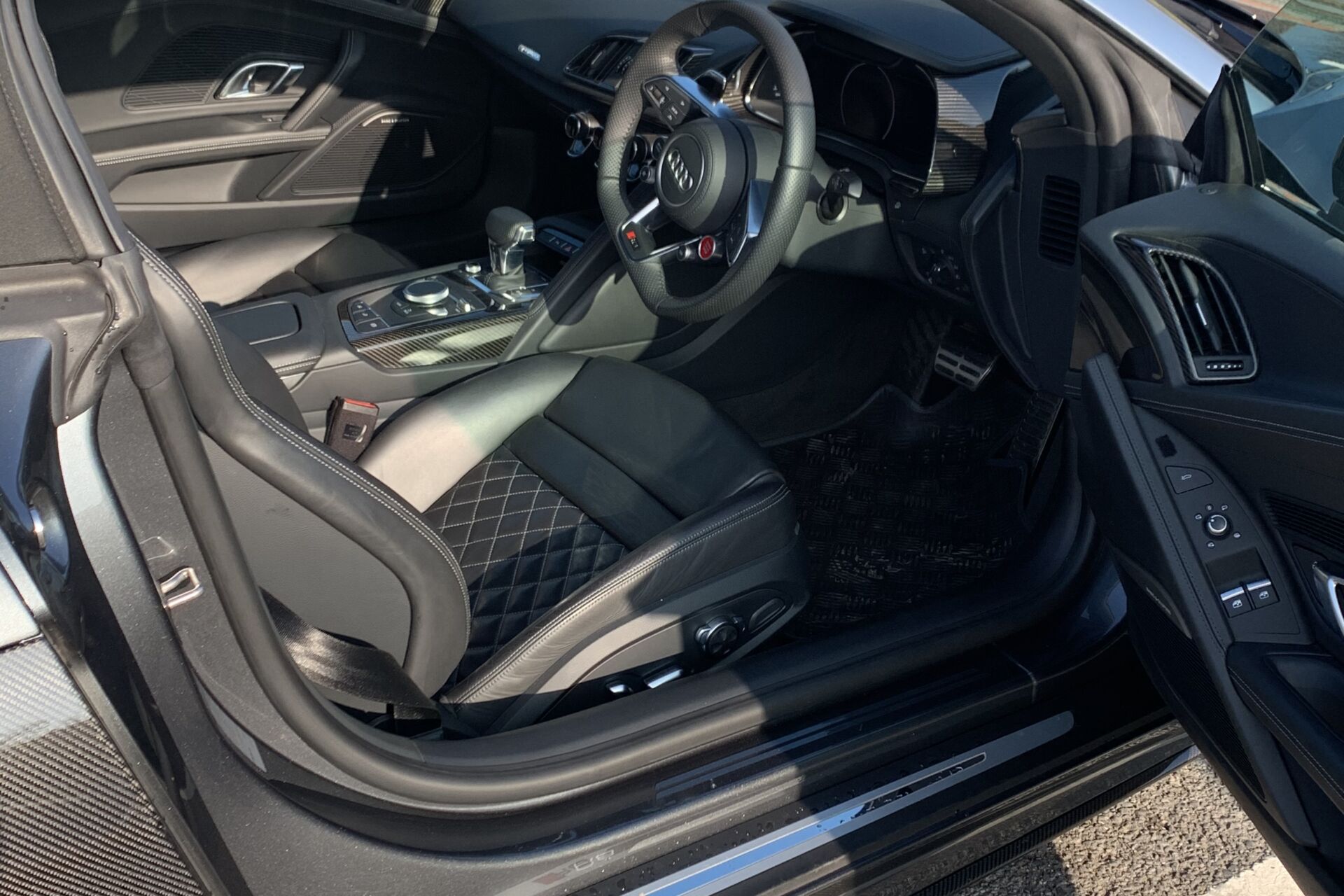 The Audi R8 V10 Plus Spyder takes everything we love about the coupe but brings you closer to the sound of that glorious V10. With a fully electric retractable soft top roof the Spyder quickly transforms itself in around 20 seconds revealing a large vent adorned rear deck, hiding the monstrous engine beneath. This particular car is swathed in carbon fibre which offsets the beautiful Daytona Grey paintwork, and there is a full PPF wrap on the car which will the paint looking fabulous. The Spyder also benefits from a retractable glass rear window, which when the hood is down acts as a brilliant wind deflector keeping buffeting in the cabin to a minimum allowing the Bang and Olufsen sound system to add to the visceral experience.
